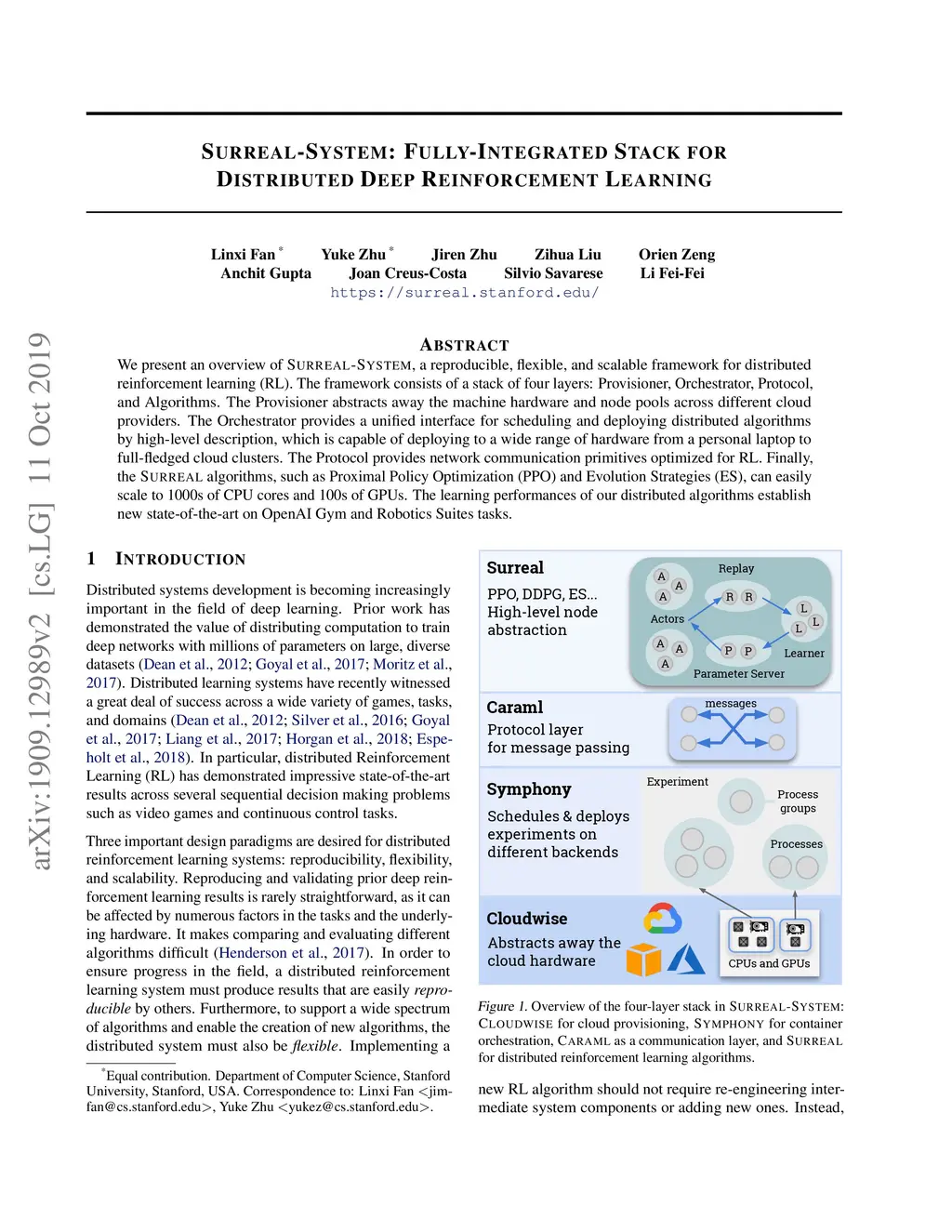 We present an overview of SURREAL-System, a reproducible, flexible, and scalable framework for distributed reinforcement learning (RL). The framework consists of a stack of four layers: Provisioner, Orchestrator, Protocol, and Algorithms. The Provisioner abstracts away the machine hardware and node pools across different cloud providers. The Orchestrator provides a unified interface for scheduling and deploying distributed algorithms by high-level description, which is capable of deploying to a wide range of hardware from a personal laptop to full-fledged cloud clusters. The Protocol provides network communication primitives optimized for RL. Finally, the SURREAL algorithms, such as Proximal Policy Optimization (PPO) and Evolution Strategies (ES), can easily scale to 1000s of CPU cores and 100s of GPUs. The learning performances of our distributed algorithms establish new state-of-the-art on OpenAI Gym and Robotics Suites tasks.