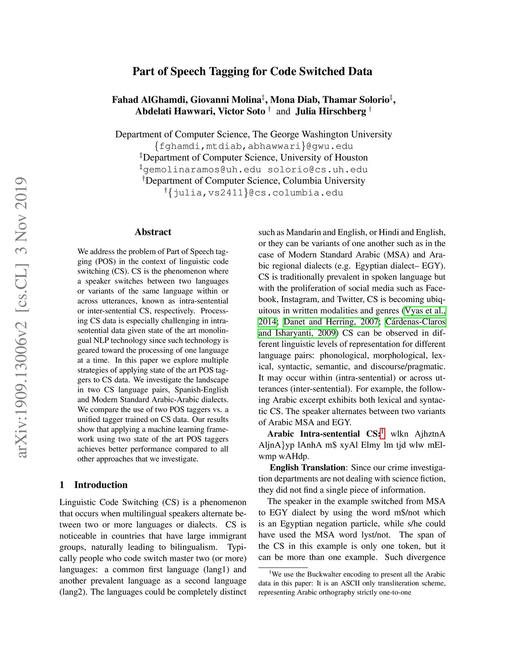 Part of speech tagging for code switched data