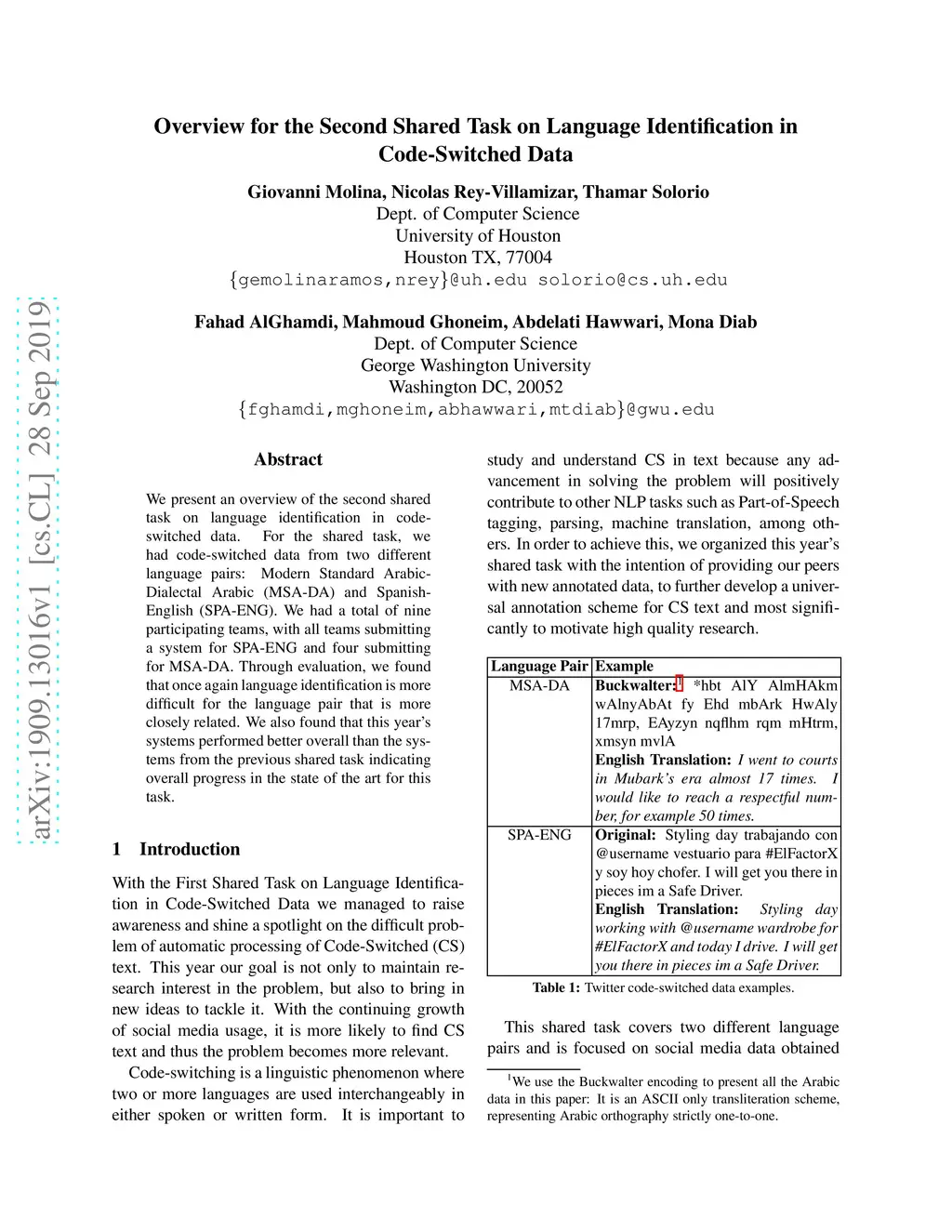 We present an overview of the second shared task on language identification in code-switched data. For the shared task, we had code-switched data from two different language pairs: Modern Standard Arabic-Dialectal Arabic (MSA-DA) and Spanish-English (SPA-ENG). We had a total of nine participating teams, with all teams submitting a system for SPA-ENG and four submitting for MSA-DA. Through evaluation, we found that once again language identification is more difficult for the language pair that is more closely related. We also found that this year's systems performed better overall than the systems from the previous shared task indicating overall progress in the state of the art for this task.
