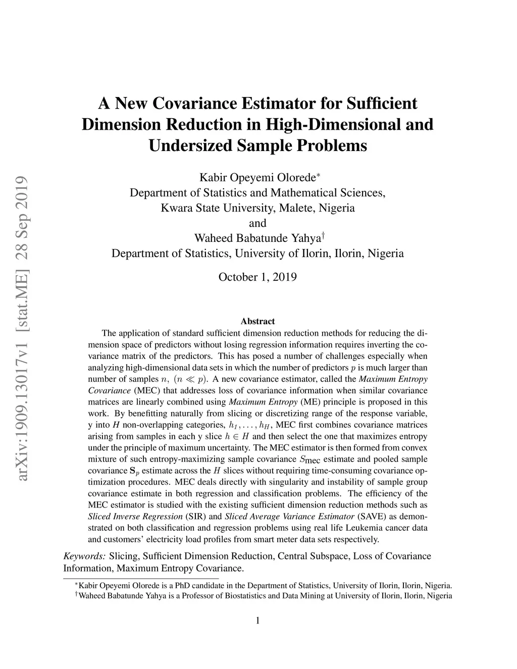 The application of standard sufficient dimension reduction methods for reducing the dimension space of predictors without losing regression information requires inverting the covariance matrix of the predictors. This has posed a number of challenges especially when analyzing high-dimensional data sets in which the number of predictors is much larger than number of samples . A new covariance estimator, called the \textit{Maximum Entropy Covariance} (MEC) that addresses loss of covariance information when similar covariance matrices are linearly combined using \textit{Maximum Entropy} (ME) principle is proposed in this work. By benefitting naturally from slicing or discretizing range of the response variable, y into \textit{H} non-overlapping categories, , MEC first combines covariance matrices arising from samples in each y slice and then select the one that maximizes entropy under the principle of maximum uncertainty. The MEC estimator is then formed from convex mixture of such entropy-maximizing sample covariance estimate and pooled sample covariance estimate across the slices without requiring time-consuming covariance optimization procedures. MEC deals directly with singularity and instability of sample group covariance estimate in both regression and classification problems. The efficiency of the MEC estimator is studied with the existing sufficient dimension reduction methods such as \textit{Sliced Inverse Regression} (SIR) and \textit{Sliced Average Variance Estimator} (SAVE) as demonstrated on both classification and regression problems using real life Leukemia cancer data and customers' electricity load profiles from smart meter data sets respectively.