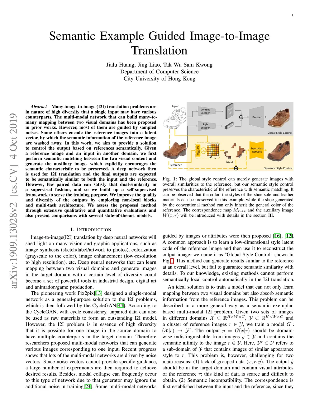 Many image-to-image (I2I) translation problems are in nature of high diversity that a single input may have various counterparts. Prior works proposed the multi-modal network that can build a many-to-many mapping between two visual domains. However, most of them are guided by sampled noises. Some others encode the reference images into a latent vector, by which the semantic information of the reference image will be washed away. In this work, we aim to provide a solution to control the output based on references semantically. Given a reference image and an input in another domain, a semantic matching is first performed between the two visual contents and generates the auxiliary image, which is explicitly encouraged to preserve semantic characteristics of the reference. A deep network then is used for I2I translation and the final outputs are expected to be semantically similar to both the input and the reference; however, no such paired data can satisfy that dual-similarity in a supervised fashion, so we build up a self-supervised framework to serve the training purpose. We improve the quality and diversity of the outputs by employing non-local blocks and a multi-task architecture. We assess the proposed method through extensive qualitative and quantitative evaluations and also presented comparisons with several state-of-art models.