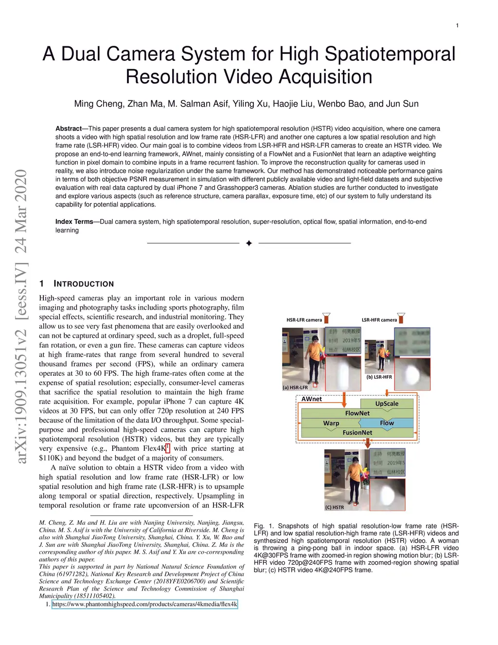 This paper presents a dual camera system for high spatiotemporal resolution (HSTR) video acquisition, where one camera shoots a video with high spatial resolution and low frame rate (HSR-LFR) and another one captures a low spatial resolution and high frame rate (LSR-HFR) video. Our main goal is to combine videos from LSR-HFR and HSR-LFR cameras to create an HSTR video. We propose an end-to-end learning framework, AWnet, mainly consisting of a FlowNet and a FusionNet that learn an adaptive weighting function in pixel domain to combine inputs in a frame recurrent fashion. To improve the reconstruction quality for cameras used in reality, we also introduce noise regularization under the same framework. Our method has demonstrated noticeable performance gains in terms of both objective PSNR measurement in simulation with different publicly available video and light-field datasets and subjective evaluation with real data captured by dual iPhone 7 and Grasshopper3 cameras. Ablation studies are further conducted to investigate and explore various aspects (such as reference structure, camera parallax, exposure time, etc) of our system to fully understand its capability for potential applications.