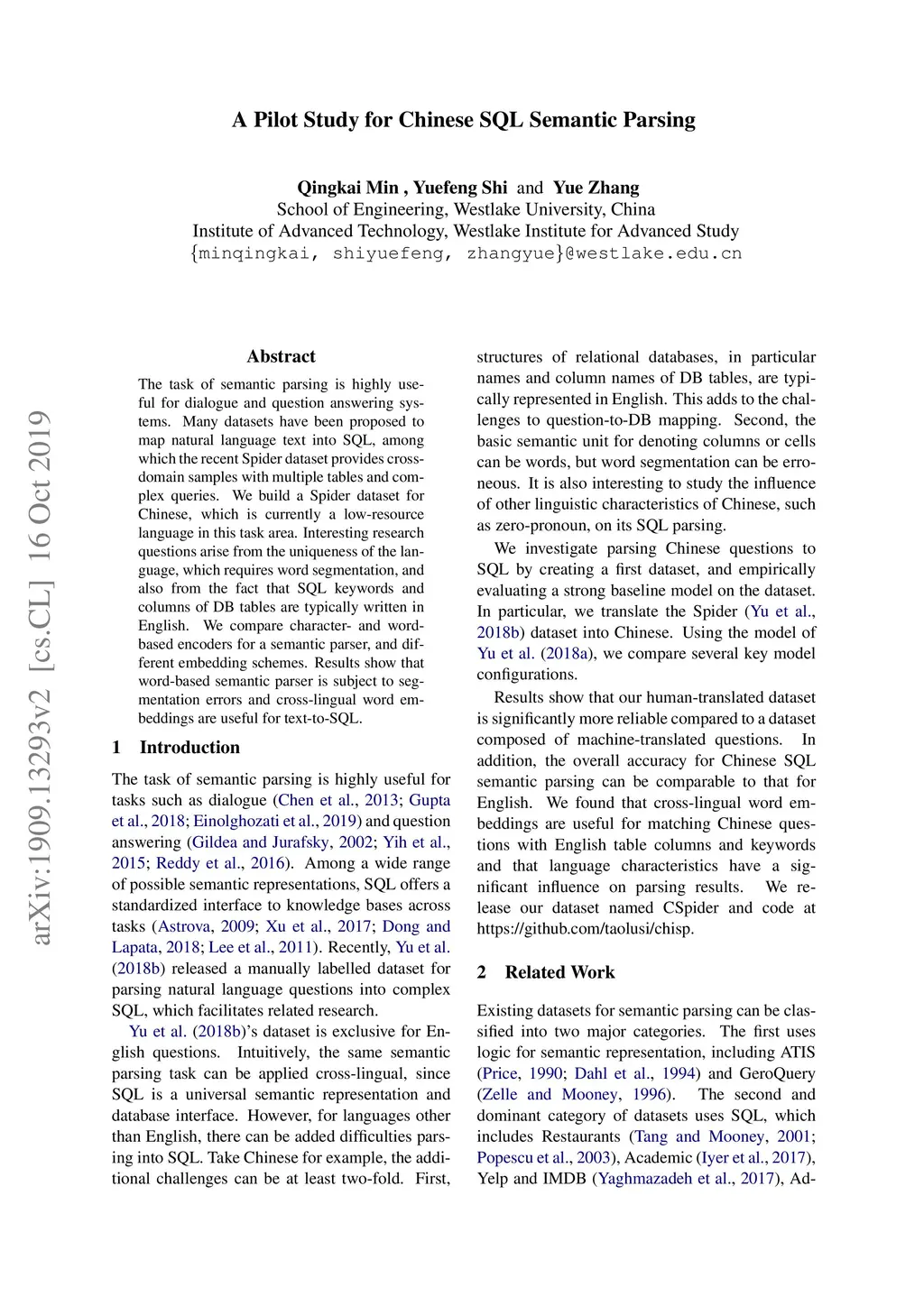 The task of semantic parsing is highly useful for dialogue and question answering systems. Many datasets have been proposed to map natural language text into SQL, among which the recent Spider dataset provides cross-domain samples with multiple tables and complex queries. We build a Spider dataset for Chinese, which is currently a low-resource language in this task area. Interesting research questions arise from the uniqueness of the language, which requires word segmentation, and also from the fact that SQL keywords and columns of DB tables are typically written in English. We compare character- and word-based encoders for a semantic parser, and different embedding schemes. Results show that word-based semantic parser is subject to segmentation errors and cross-lingual word embeddings are useful for text-to-SQL.