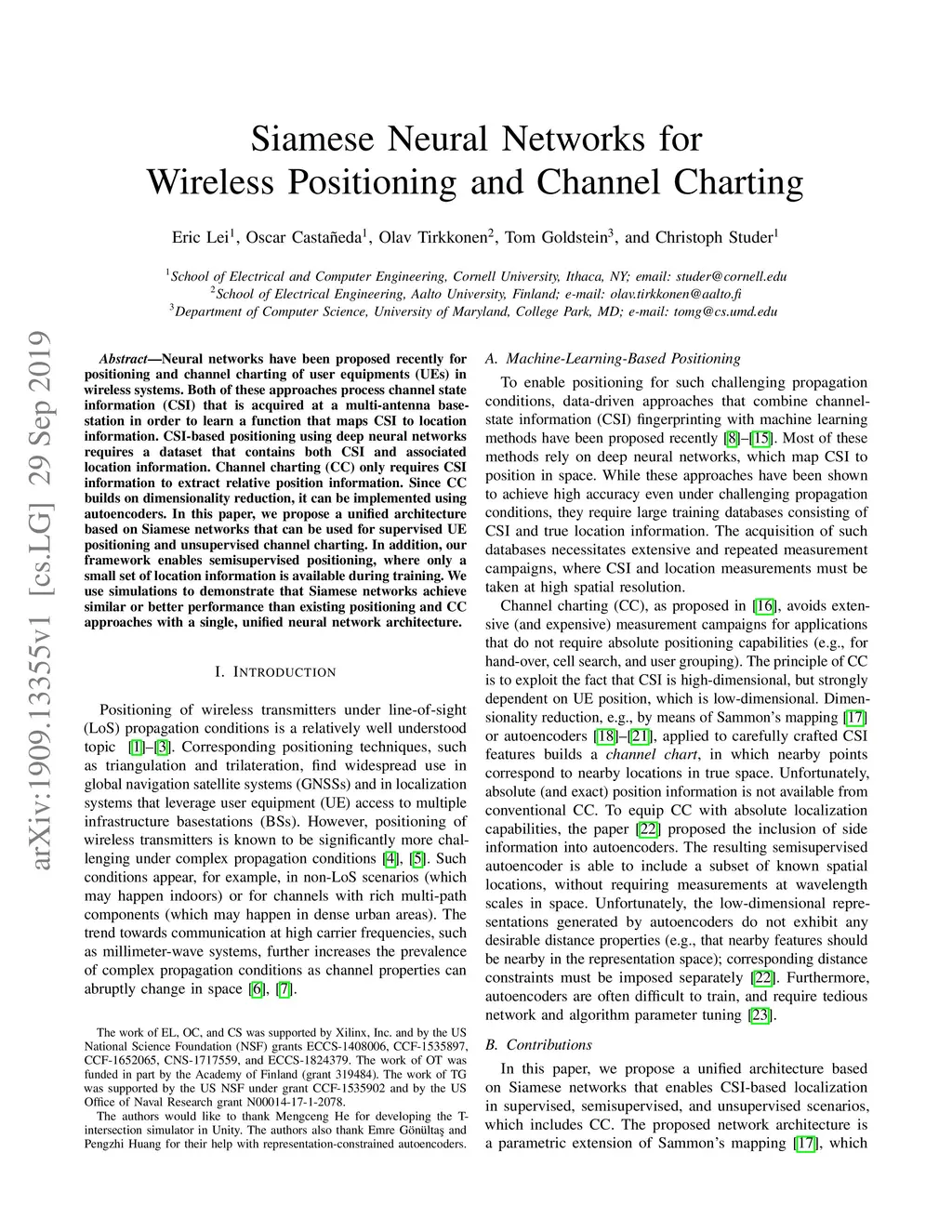 Neural networks have been proposed recently for positioning and channel charting of user equipments (UEs) in wireless systems. Both of these approaches process channel state information (CSI) that is acquired at a multi-antenna base-station in order to learn a function that maps CSI to location information. CSI-based positioning using deep neural networks requires a dataset that contains both CSI and associated location information. Channel charting (CC) only requires CSI information to extract relative position information. Since CC builds on dimensionality reduction, it can be implemented using autoencoders. In this paper, we propose a unified architecture based on Siamese networks that can be used for supervised UE positioning and unsupervised channel charting. In addition, our framework enables semisupervised positioning, where only a small set of location information is available during training. We use simulations to demonstrate that Siamese networks achieve similar or better performance than existing positioning and CC approaches with a single, unified neural network architecture.