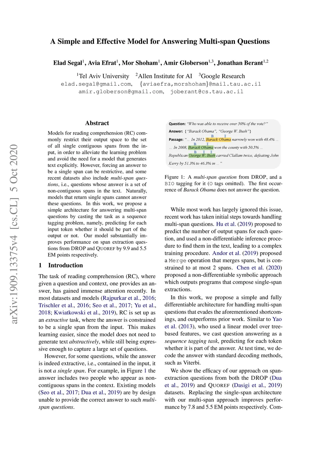Models for reading comprehension (RC) commonly restrict their output space to the set of all single contiguous spans from the input, in order to alleviate the learning problem and avoid the need for a model that generates text explicitly. However, forcing an answer to be a single span can be restrictive, and some recent datasets also include multi-span questions, i.e., questions whose answer is a set of non-contiguous spans in the text. Naturally, models that return single spans cannot answer these questions. In this work, we propose a simple architecture for answering multi-span questions by casting the task as a sequence tagging problem, namely, predicting for each input token whether it should be part of the output or not. Our model substantially improves performance on span extraction questions from DROP and Quoref by 9.9 and 5.5 EM points respectively.