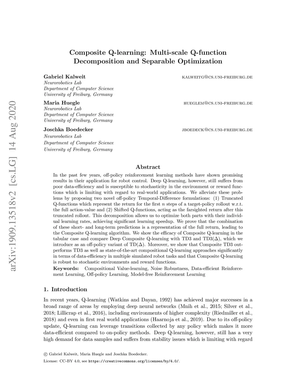 In the past few years, off-policy reinforcement learning methods have shown promising results in their application for robot control. Deep Q-learning, however, still suffers from poor data-efficiency and is susceptible to stochasticity in the environment or reward functions which is limiting with regard to real-world applications. We alleviate these problems by proposing two novel off-policy Temporal-Difference formulations: (1) Truncated Q-functions which represent the return for the first n steps of a target-policy rollout w.r.t. the full action-value and (2) Shifted Q-functions, acting as the farsighted return after this truncated rollout. This decomposition allows us to optimize both parts with their individual learning rates, achieving significant learning speedup. We prove that the combination of these short- and long-term predictions is a representation of the full return, leading to the Composite Q-learning algorithm. We show the efficacy of Composite Q-learning in the tabular case and compare Deep Composite Q-learning with TD3 and TD3(Delta), which we introduce as an off-policy variant of TD(Delta). Moreover, we show that Composite TD3 outperforms TD3 as well as state-of-the-art compositional Q-learning approaches significantly in terms of data-efficiency in multiple simulated robot tasks and that Composite Q-learning is robust to stochastic environments and reward functions.