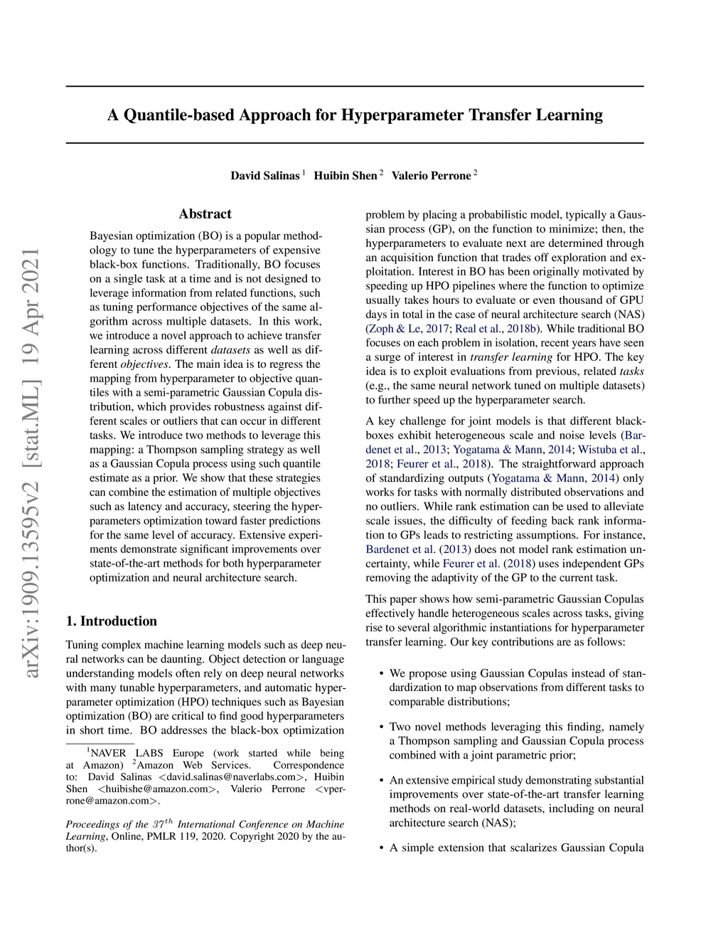 Bayesian optimization (BO) is a popular methodology to tune the hyperparameters of expensive black-box functions. Traditionally, BO focuses on a single task at a time and is not designed to leverage information from related functions, such as tuning performance objectives of the same algorithm across multiple datasets. In this work, we introduce a novel approach to achieve transfer learning across different \emph{datasets} as well as different \emph{objectives}. The main idea is to regress the mapping from hyperparameter to objective quantiles with a semi-parametric Gaussian Copula distribution, which provides robustness against different scales or outliers that can occur in different tasks. We introduce two methods to leverage this mapping: a Thompson sampling strategy as well as a Gaussian Copula process using such quantile estimate as a prior. We show that these strategies can combine the estimation of multiple objectives such as latency and accuracy, steering the hyperparameters optimization toward faster predictions for the same level of accuracy. Extensive experiments demonstrate significant improvements over state-of-the-art methods for both hyperparameter optimization and neural architecture search.
