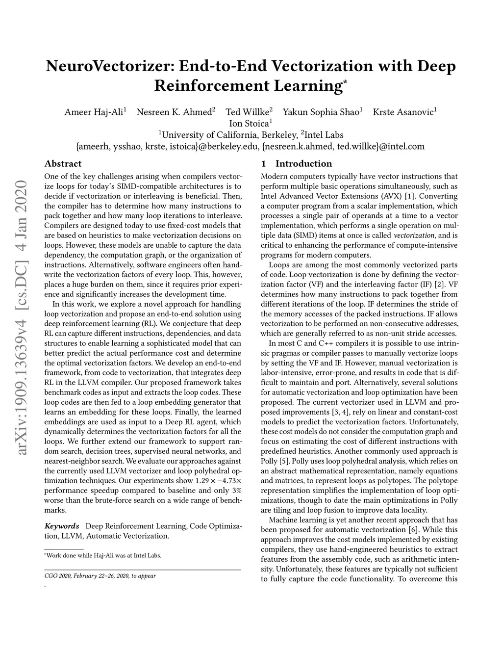 One of the key challenges arising when compilers vectorize loops for today's SIMD-compatible architectures is to decide if vectorization or interleaving is beneficial. Then, the compiler has to determine how many instructions to pack together and how many loop iterations to interleave. Compilers are designed today to use fixed-cost models that are based on heuristics to make vectorization decisions on loops. However, these models are unable to capture the data dependency, the computation graph, or the organization of instructions. Alternatively, software engineers often hand-write the vectorization factors of every loop. This, however, places a huge burden on them, since it requires prior experience and significantly increases the development time. In this work, we explore a novel approach for handling loop vectorization and propose an end-to-end solution using deep reinforcement learning (RL). We conjecture that deep RL can capture different instructions, dependencies, and data structures to enable learning a sophisticated model that can better predict the actual performance cost and determine the optimal vectorization factors. We develop an end-to-end framework, from code to vectorization, that integrates deep RL in the LLVM compiler. Our proposed framework takes benchmark codes as input and extracts the loop codes. These loop codes are then fed to a loop embedding generator that learns an embedding for these loops. Finally, the learned embeddings are used as input to a Deep RL agent, which determines the vectorization factors for all the loops. We further extend our framework to support multiple supervised learning methods. We evaluate our approaches against the currently used LLVM vectorizer and loop polyhedral optimization techniques. Our experiments show 1.29X-4.73X performance speedup compared to baseline and only 3% worse than the brute-force search on a wide range of benchmarks.