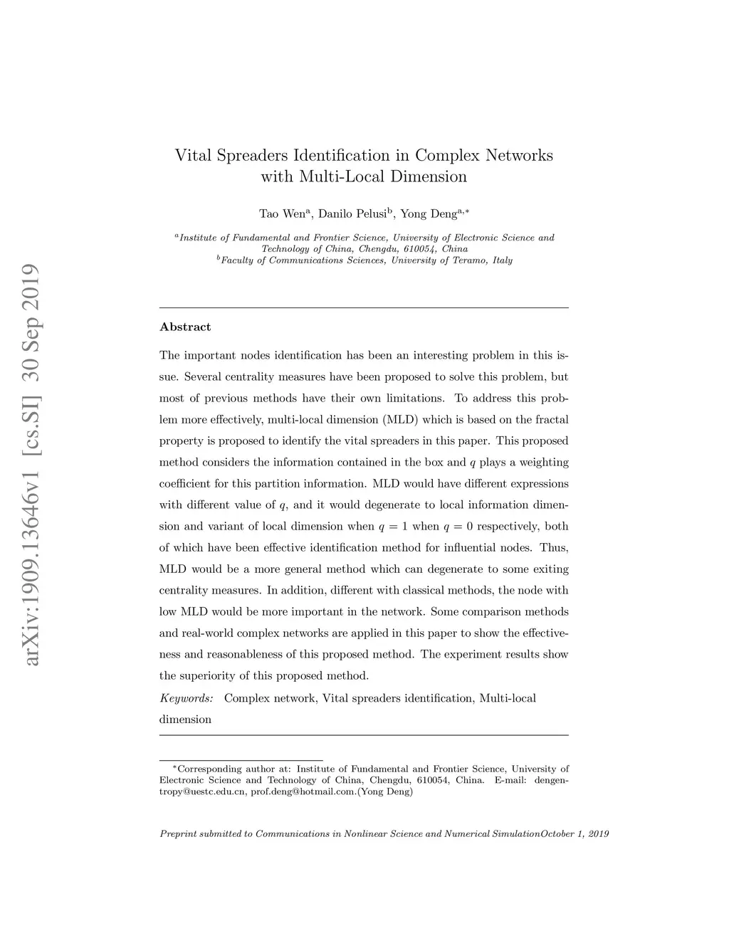The important nodes identification has been an interesting problem in this issue. Several centrality measures have been proposed to solve this problem, but most of previous methods have their own limitations. To address this problem more effectively, multi-local dimension (MLD) which is based on the fractal property is proposed to identify the vital spreaders in this paper. This proposed method considers the information contained in the box and plays a weighting coefficient for this partition information. MLD would have different expressions with different value of , and it would degenerate to local information dimension and variant of local dimension when when respectively, both of which have been effective identification method for influential nodes. Thus, MLD would be a more general method which can degenerate to some exiting centrality measures. In addition, different with classical methods, the node with low MLD would be more important in the network. Some comparison methods and real-world complex networks are applied in this paper to show the effectiveness and reasonableness of this proposed method. The experiment results show the superiority of this proposed method.