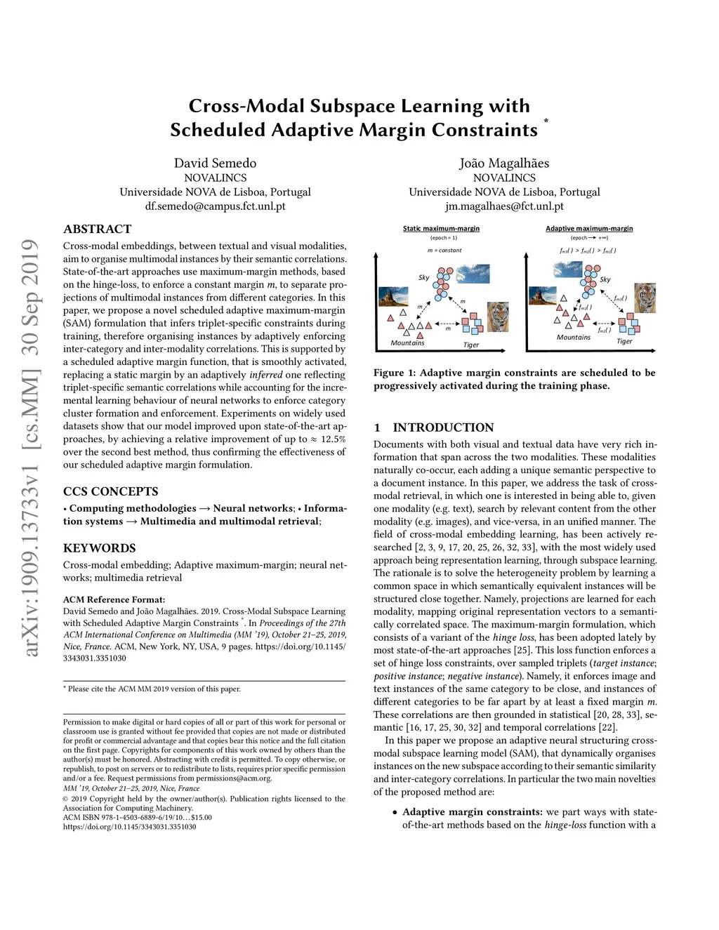Cross-modal embeddings, between textual and visual modalities, aim to organise multimodal instances by their semantic correlations. State-of-the-art approaches use maximum-margin methods, based on the hinge-loss, to enforce a constant margin m, to separate projections of multimodal instances from different categories. In this paper, we propose a novel scheduled adaptive maximum-margin (SAM) formulation that infers triplet-specific constraints during training, therefore organising instances by adaptively enforcing inter-category and inter-modality correlations. This is supported by a scheduled adaptive margin function, that is smoothly activated, replacing a static margin by an adaptively inferred one reflecting triplet-specific semantic correlations while accounting for the incremental learning behaviour of neural networks to enforce category cluster formation and enforcement. Experiments on widely used datasets show that our model improved upon state-of-the-art approaches, by achieving a relative improvement of up to ~12.5% over the second best method, thus confirming the effectiveness of our scheduled adaptive margin formulation.