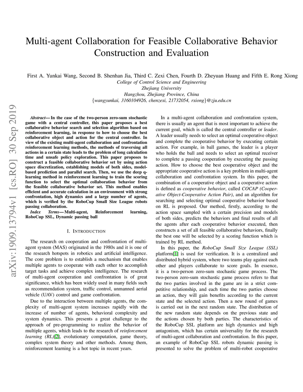 In the case of the two-person zero-sum stochastic game with a central controller, this paper proposes a best collaborative behavior search and selection algorithm based on reinforcement learning, in response to how to choose the best collaborative object and action for the central controller. In view of the existing multi-agent collaboration and confrontation reinforcement learning methods, the methods of traversing all actions in a certain state leads to the problem of long calculation time and unsafe policy exploration. This paper proposes to construct a feasible collaborative behavior set by using action space discretization, establishing models of both sides, model-based prediction and parallel search. Then, we use the deep q-learning method in reinforcement learning to train the scoring function to select the optimal collaboration behavior from the feasible collaborative behavior set. This method enables efficient and accurate calculation in an environment with strong confrontation, high dynamics and a large number of agents, which is verified by the RoboCup Small Size League robots passing collaboration.