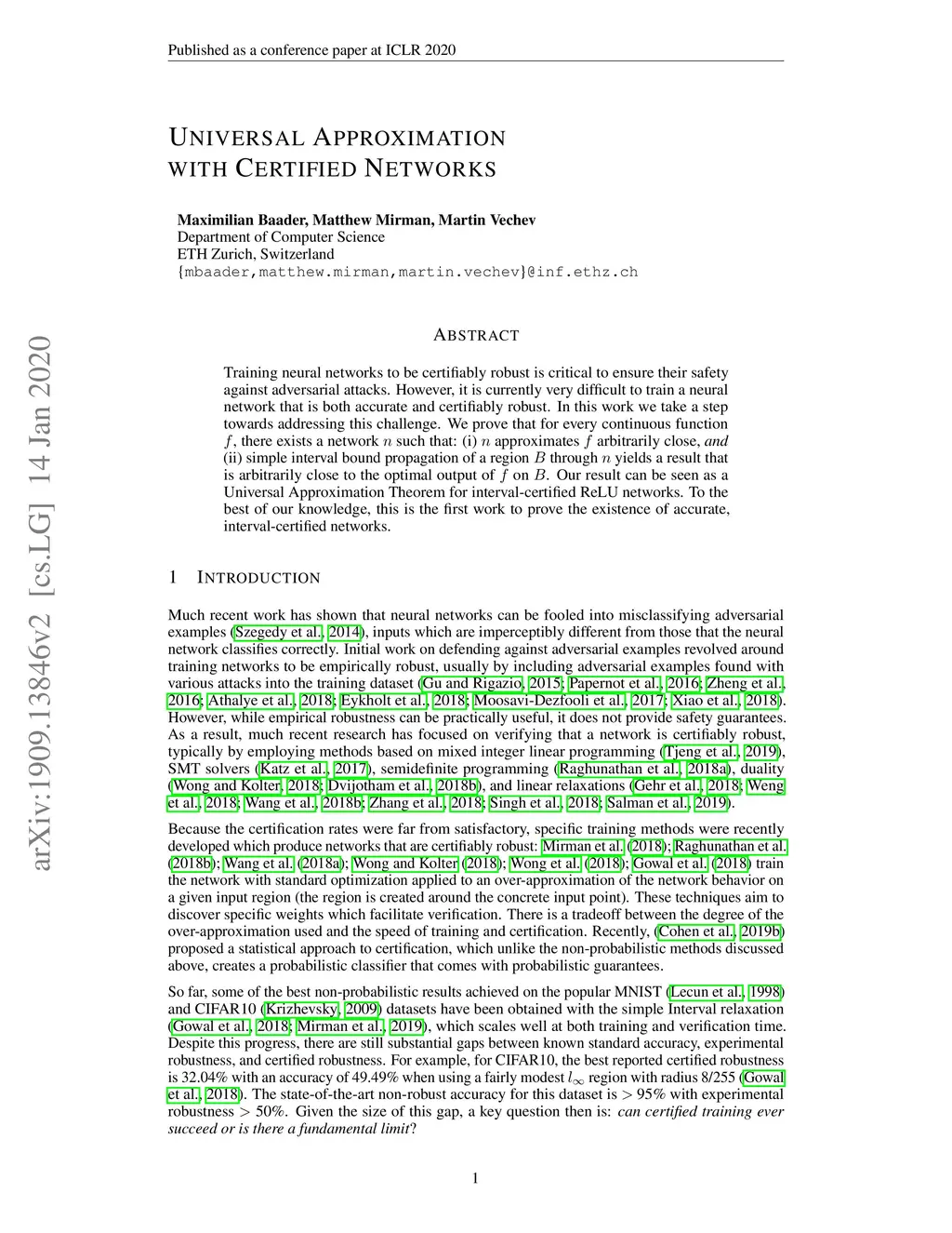 Training neural networks to be certifiably robust is critical to ensure their safety against adversarial attacks. However, it is currently very difficult to train a neural network that is both accurate and certifiably robust. In this work we take a step towards addressing this challenge. We prove that for every continuous function , there exists a network such that: (i) approximates arbitrarily close, and (ii) simple interval bound propagation of a region through yields a result that is arbitrarily close to the optimal output of on . Our result can be seen as a Universal Approximation Theorem for interval-certified ReLU networks. To the best of our knowledge, this is the first work to prove the existence of accurate, interval-certified networks.