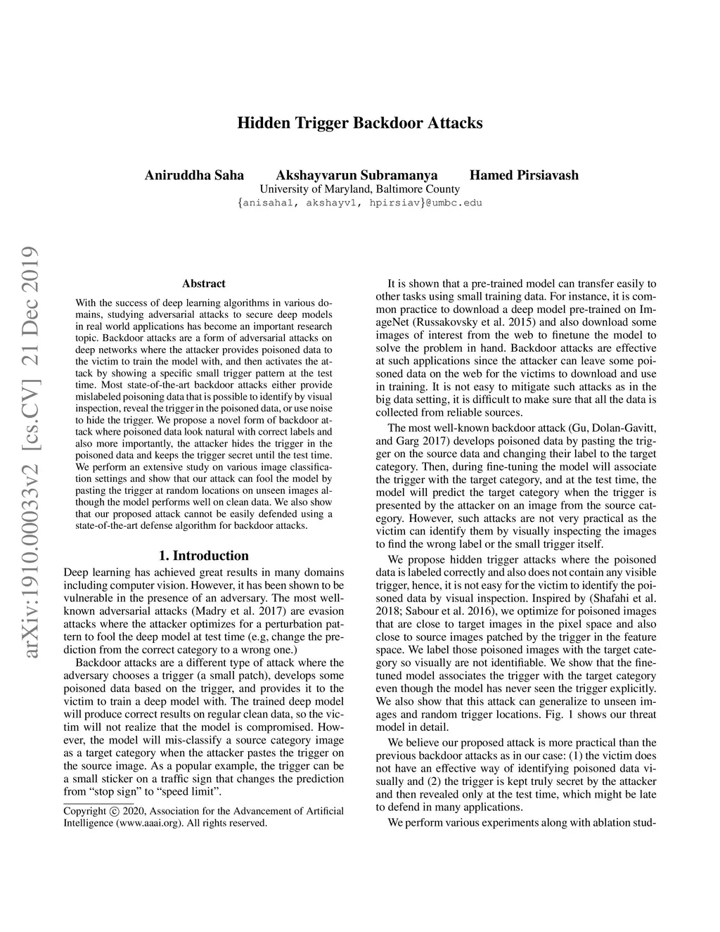 With the success of deep learning algorithms in various domains, studying adversarial attacks to secure deep models in real world applications has become an important research topic. Backdoor attacks are a form of adversarial attacks on deep networks where the attacker provides poisoned data to the victim to train the model with, and then activates the attack by showing a specific small trigger pattern at the test time. Most state-of-the-art backdoor attacks either provide mislabeled poisoning data that is possible to identify by visual inspection, reveal the trigger in the poisoned data, or use noise to hide the trigger. We propose a novel form of backdoor attack where poisoned data look natural with correct labels and also more importantly, the attacker hides the trigger in the poisoned data and keeps the trigger secret until the test time. We perform an extensive study on various image classification settings and show that our attack can fool the model by pasting the trigger at random locations on unseen images although the model performs well on clean data. We also show that our proposed attack cannot be easily defended using a state-of-the-art defense algorithm for backdoor attacks.