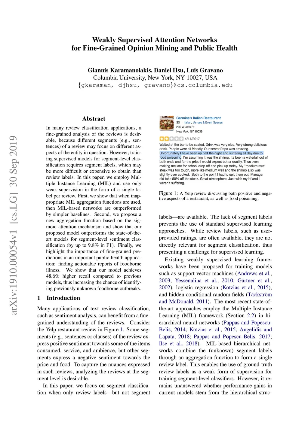 In many review classification applications, a fine-grained analysis of the reviews is desirable, because different segments (e.g., sentences) of a review may focus on different aspects of the entity in question. However, training supervised models for segment-level classification requires segment labels, which may be more difficult or expensive to obtain than review labels. In this paper, we employ Multiple Instance Learning (MIL) and use only weak supervision in the form of a single label per review. First, we show that when inappropriate MIL aggregation functions are used, then MIL-based networks are outperformed by simpler baselines. Second, we propose a new aggregation function based on the sigmoid attention mechanism and show that our proposed model outperforms the state-of-the-art models for segment-level sentiment classification (by up to 9.8% in F1). Finally, we highlight the importance of fine-grained predictions in an important public-health application: finding actionable reports of foodborne illness. We show that our model achieves 48.6% higher recall compared to previous models, thus increasing the chance of identifying previously unknown foodborne outbreaks.