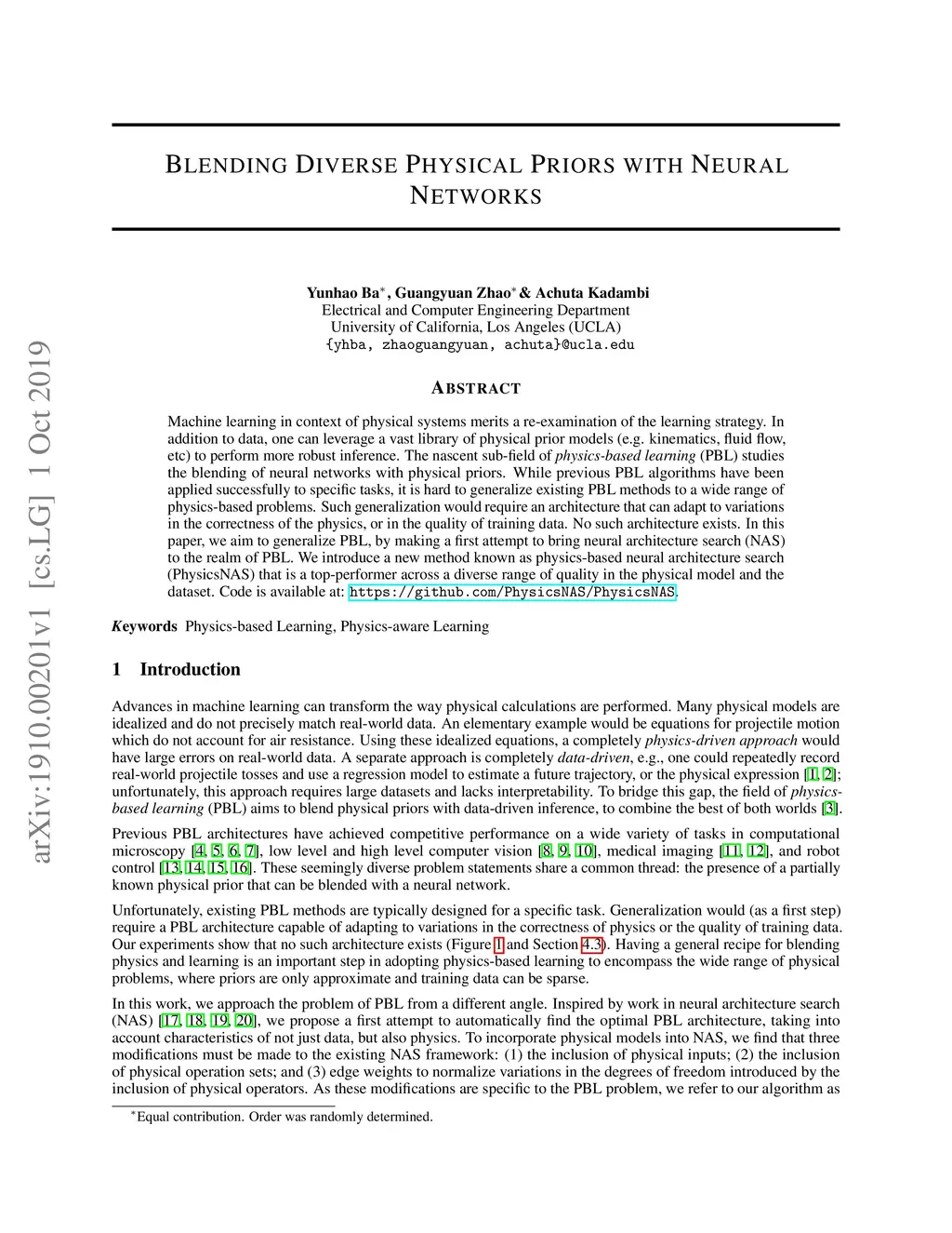 Machine learning in context of physical systems merits a re-examination of the learning strategy. In addition to data, one can leverage a vast library of physical prior models (e.g. kinematics, fluid flow, etc) to perform more robust inference. The nascent sub-field of \emph{physics-based learning} (PBL) studies the blending of neural networks with physical priors. While previous PBL algorithms have been applied successfully to specific tasks, it is hard to generalize existing PBL methods to a wide range of physics-based problems. Such generalization would require an architecture that can adapt to variations in the correctness of the physics, or in the quality of training data. No such architecture exists. In this paper, we aim to generalize PBL, by making a first attempt to bring neural architecture search (NAS) to the realm of PBL. We introduce a new method known as physics-based neural architecture search (PhysicsNAS) that is a top-performer across a diverse range of quality in the physical model and the dataset.