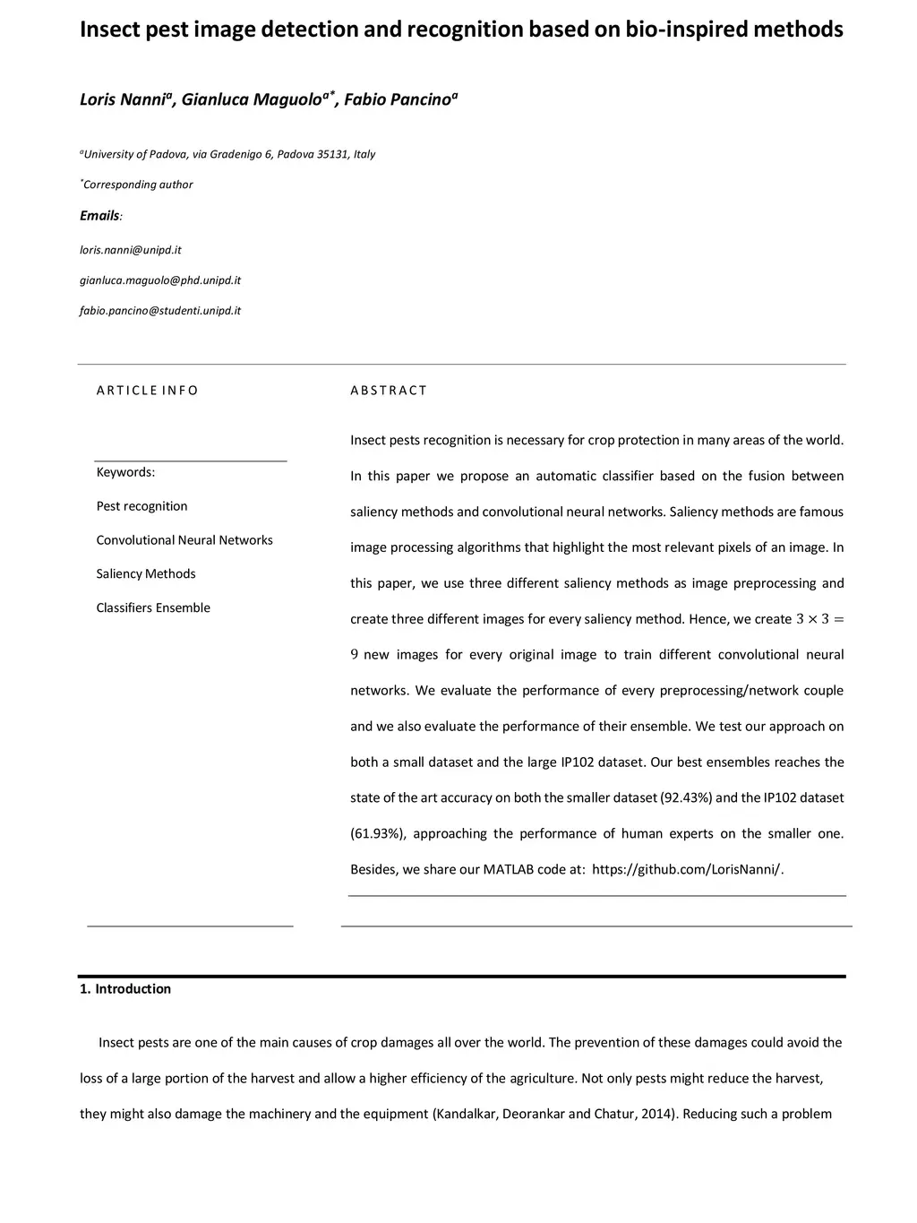 Insect pests recognition is necessary for crop protection in many areas of the world. In this paper we propose an automatic classifier based on the fusion between saliency methods and convolutional neural networks. Saliency methods are famous image processing algorithms that highlight the most relevant pixels of an image. In this paper, we use three different saliency methods as image preprocessing and create three different images for every saliency method. Hence, we create 3x3=9 new images for every original image to train different convolutional neural networks. We evaluate the performance of every preprocessing/network couple and we also evaluate the performance of their ensemble. We test our approach on both a small dataset and the large IP102 dataset. Our best ensembles reaches the state of the art accuracy on both the smaller dataset (92.43%) and the IP102 dataset (61.93%), approaching the performance of human experts on the smaller one. Besides, we share our MATLAB code at: https://github.com/LorisNanni/.
