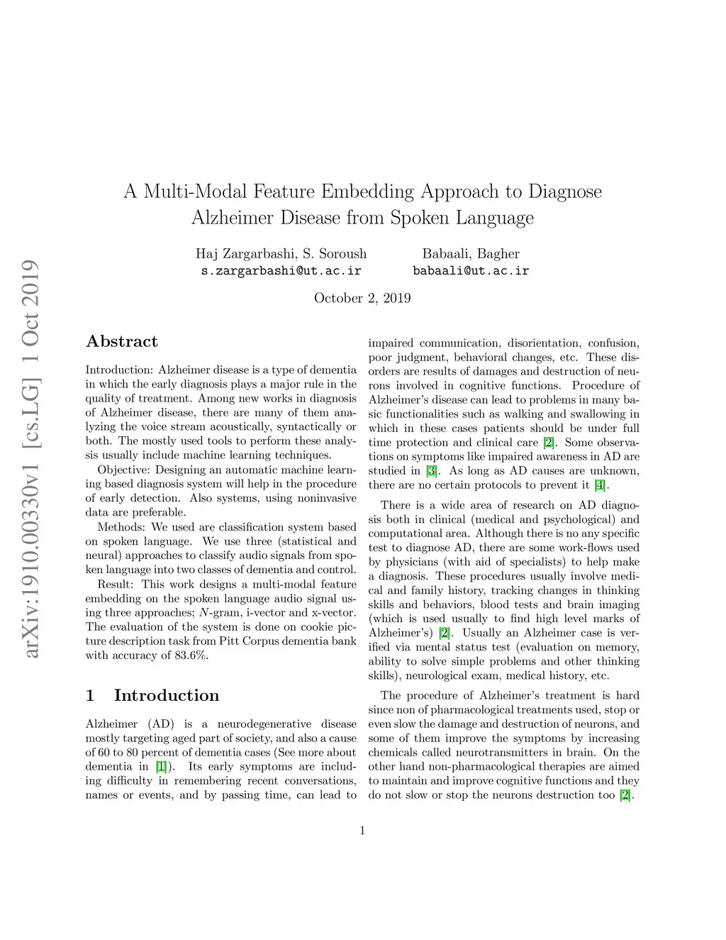 Introduction: Alzheimer's disease is a type of dementia in which early diagnosis plays a major rule in the quality of treatment. Among new works in the diagnosis of Alzheimer's disease, there are many of them analyzing the voice stream acoustically, syntactically or both. The mostly used tools to perform these analysis usually include machine learning techniques. Objective: Designing an automatic machine learning based diagnosis system will help in the procedure of early detection. Also, systems, using noninvasive data are preferable. Methods: We used are classification system based on spoken language. We use three (statistical and neural) approaches to classify audio signals from spoken language into two classes of dementia and control. Result: This work designs a multi-modal feature embedding on the spoken language audio signal using three approaches; N-gram, i-vector, and x-vector. The evaluation of the system is done on the cookie picture description task from Pitt Corpus dementia bank with the accuracy of 83:6
