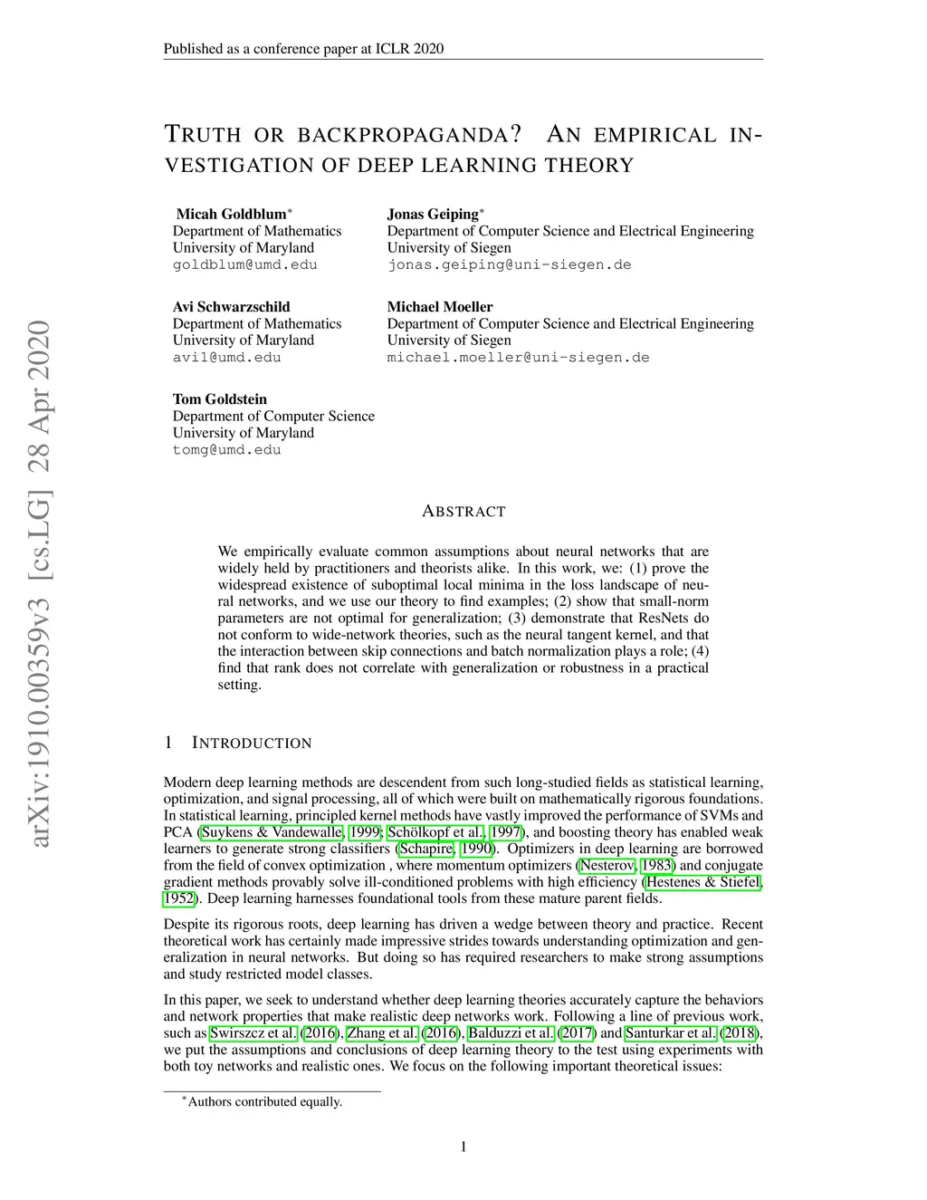 We empirically evaluate common assumptions about neural networks that are widely held by practitioners and theorists alike. In this work, we: (1) prove the widespread existence of suboptimal local minima in the loss landscape of neural networks, and we use our theory to find examples; (2) show that small-norm parameters are not optimal for generalization; (3) demonstrate that ResNets do not conform to wide-network theories, such as the neural tangent kernel, and that the interaction between skip connections and batch normalization plays a role; (4) find that rank does not correlate with generalization or robustness in a practical setting.