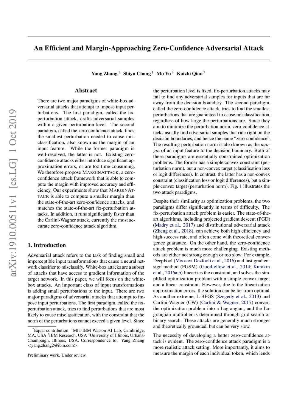 There are two major paradigms of white-box adversarial attacks that attempt to impose input perturbations. The first paradigm, called the fix-perturbation attack, crafts adversarial samples within a given perturbation level. The second paradigm, called the zero-confidence attack, finds the smallest perturbation needed to cause mis-classification, also known as the margin of an input feature. While the former paradigm is well-resolved, the latter is not. Existing zero-confidence attacks either introduce significant ap-proximation errors, or are too time-consuming. We therefore propose MARGINATTACK, a zero-confidence attack framework that is able to compute the margin with improved accuracy and efficiency. Our experiments show that MARGINATTACK is able to compute a smaller margin than the state-of-the-art zero-confidence attacks, and matches the state-of-the-art fix-perturbation at-tacks. In addition, it runs significantly faster than the Carlini-Wagner attack, currently the most ac-curate zero-confidence attack algorithm.