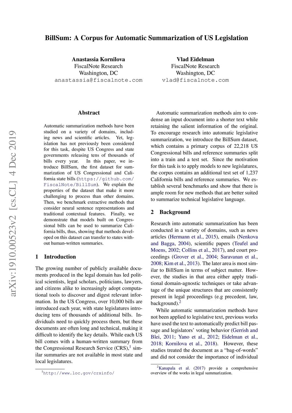 BillSum: A Corpus for Automatic Summarization of US Legislation