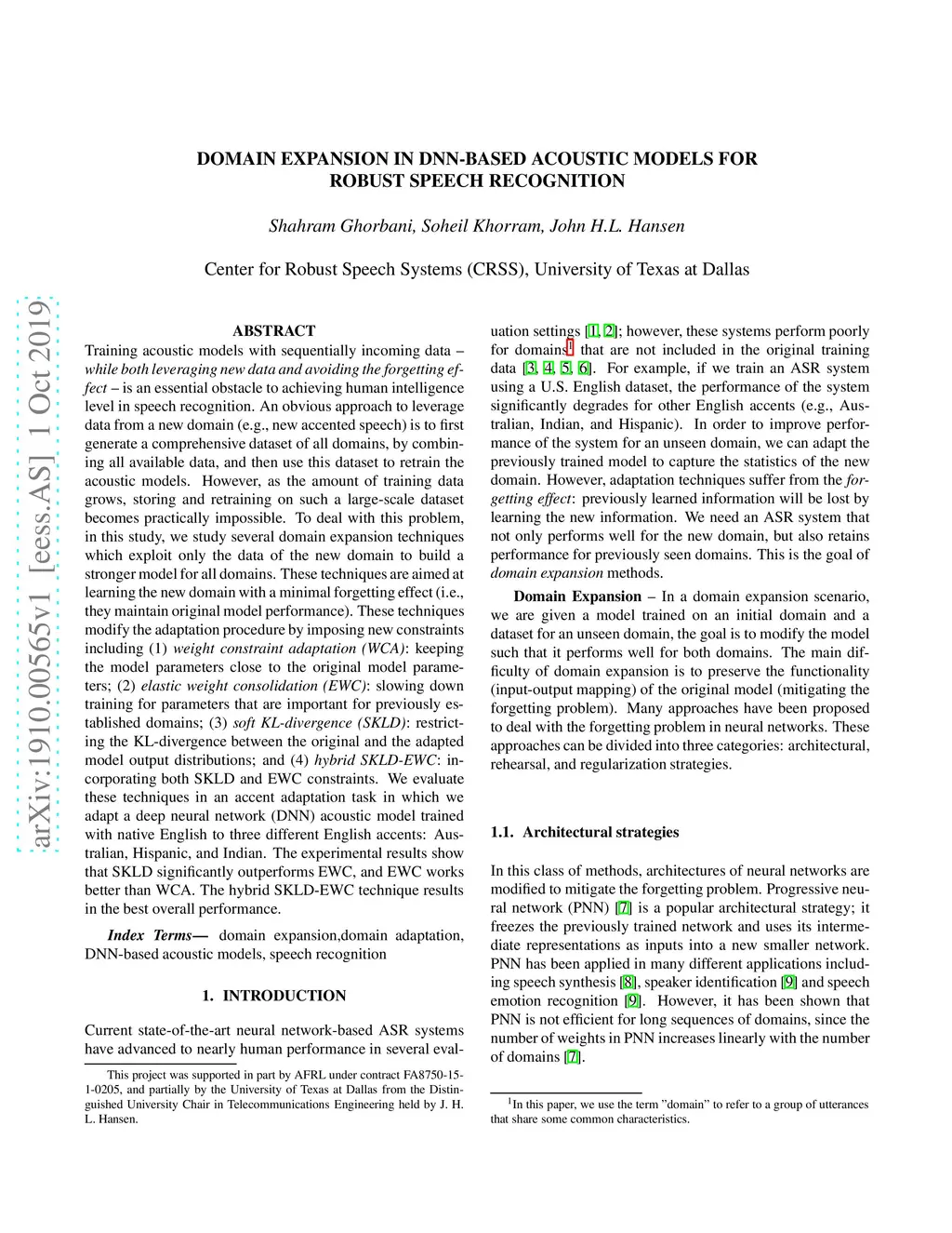 Training acoustic models with sequentially incoming data -- while both leveraging new data and avoiding the forgetting effect-- is an essential obstacle to achieving human intelligence level in speech recognition. An obvious approach to leverage data from a new domain (e.g., new accented speech) is to first generate a comprehensive dataset of all domains, by combining all available data, and then use this dataset to retrain the acoustic models. However, as the amount of training data grows, storing and retraining on such a large-scale dataset becomes practically impossible. To deal with this problem, in this study, we study several domain expansion techniques which exploit only the data of the new domain to build a stronger model for all domains. These techniques are aimed at learning the new domain with a minimal forgetting effect (i.e., they maintain original model performance). These techniques modify the adaptation procedure by imposing new constraints including (1) weight constraint adaptation (WCA): keeping the model parameters close to the original model parameters; (2) elastic weight consolidation (EWC): slowing down training for parameters that are important for previously established domains; (3) soft KL-divergence (SKLD): restricting the KL-divergence between the original and the adapted model output distributions; and (4) hybrid SKLD-EWC: incorporating both SKLD and EWC constraints. We evaluate these techniques in an accent adaptation task in which we adapt a deep neural network (DNN) acoustic model trained with native English to three different English accents: Australian, Hispanic, and Indian. The experimental results show that SKLD significantly outperforms EWC, and EWC works better than WCA. The hybrid SKLD-EWC technique results in the best overall performance.