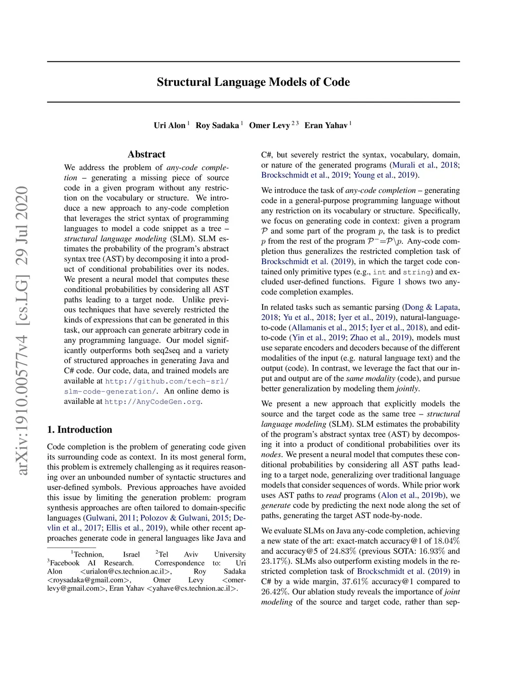 We address the problem of any-code completion - generating a missing piece of source code in a given program without any restriction on the vocabulary or structure. We introduce a new approach to any-code completion that leverages the strict syntax of programming languages to model a code snippet as a tree - structural language modeling (SLM). SLM estimates the probability of the program's abstract syntax tree (AST) by decomposing it into a product of conditional probabilities over its nodes. We present a neural model that computes these conditional probabilities by considering all AST paths leading to a target node. Unlike previous techniques that have severely restricted the kinds of expressions that can be generated in this task, our approach can generate arbitrary code in any programming language. Our model significantly outperforms both seq2seq and a variety of structured approaches in generating Java and C# code. We make our code, datasets, and models publicly available.