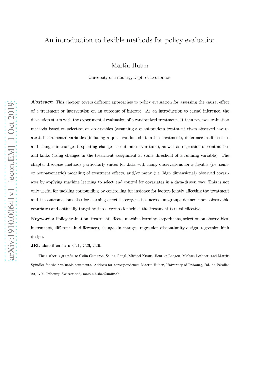 This chapter covers different approaches to policy evaluation for assessing the causal effect of a treatment or intervention on an outcome of interest. As an introduction to causal inference, the discussion starts with the experimental evaluation of a randomized treatment. It then reviews evaluation methods based on selection on observables (assuming a quasi-random treatment given observed covariates), instrumental variables (inducing a quasi-random shift in the treatment), difference-in-differences and changes-in-changes (exploiting changes in outcomes over time), as well as regression discontinuities and kinks (using changes in the treatment assignment at some threshold of a running variable). The chapter discusses methods particularly suited for data with many observations for a flexible (i.e. semi- or nonparametric) modeling of treatment effects, and/or many (i.e. high dimensional) observed covariates by applying machine learning to select and control for covariates in a data-driven way. This is not only useful for tackling confounding by controlling for instance for factors jointly affecting the treatment and the outcome, but also for learning effect heterogeneities across subgroups defined upon observable covariates and optimally targeting those groups for which the treatment is most effective.
