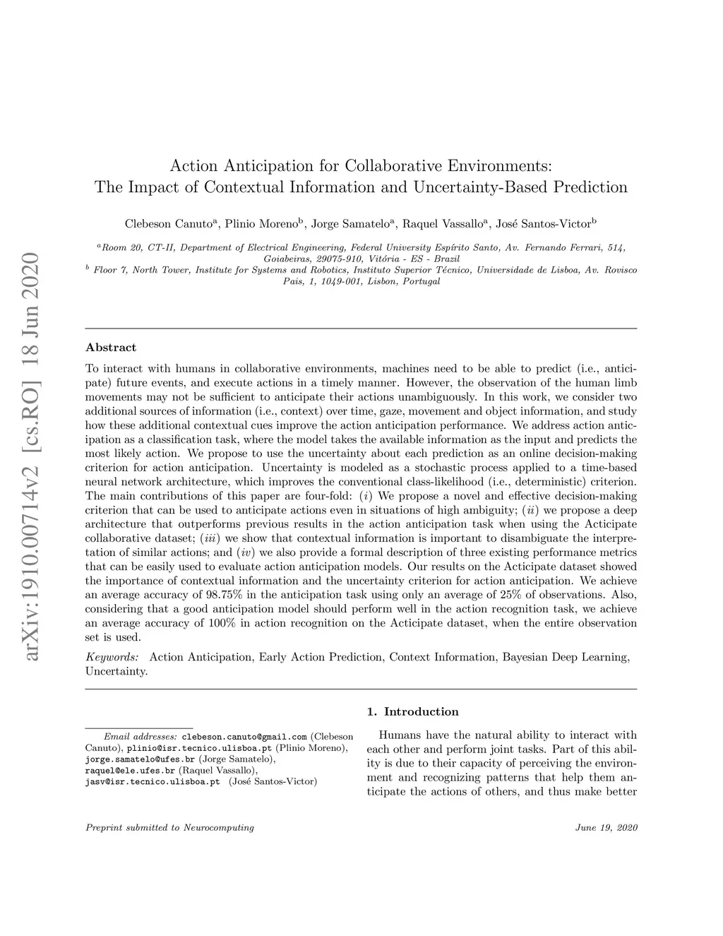 To interact with humans in collaborative environments, machines need to be able to predict (i.e., anticipate) future events, and execute actions in a timely manner. However, the observation of the human limb movements may not be sufficient to anticipate their actions unambiguously. In this work, we consider two additional sources of information (i.e., context) over time, gaze, movement and object information, and study how these additional contextual cues improve the action anticipation performance. We address action anticipation as a classification task, where the model takes the available information as the input and predicts the most likely action. We propose to use the uncertainty about each prediction as an online decision-making criterion for action anticipation. Uncertainty is modeled as a stochastic process applied to a time-based neural network architecture, which improves the conventional class-likelihood (i.e., deterministic) criterion. The main contributions of this paper are four-fold: (i) We propose a novel and effective decision-making criterion that can be used to anticipate actions even in situations of high ambiguity; (ii) we propose a deep architecture that outperforms previous results in the action anticipation task when using the Acticipate collaborative dataset; (iii) we show that contextual information is important to disambiguate the interpretation of similar actions; and (iv) we also provide a formal description of three existing performance metrics that can be easily used to evaluate action anticipation models.Our results on the Acticipate dataset showed the importance of contextual information and the uncertainty criterion for action anticipation. We achieve an average accuracy of 98.75% in the anticipation task using only an average of 25% of observations.