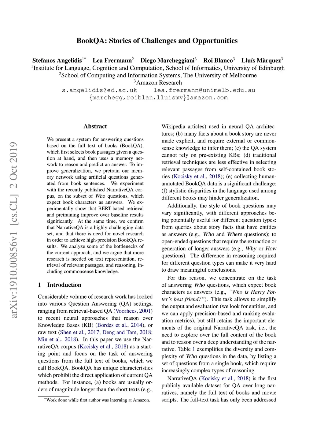We present a system for answering questions based on the full text of books (BookQA), which first selects book passages given a question at hand, and then uses a memory network to reason and predict an answer. To improve generalization, we pretrain our memory network using artificial questions generated from book sentences. We experiment with the recently published NarrativeQA corpus, on the subset of Who questions, which expect book characters as answers. We experimentally show that BERT-based retrieval and pretraining improve over baseline results significantly. At the same time, we confirm that NarrativeQA is a highly challenging data set, and that there is need for novel research in order to achieve high-precision BookQA results. We analyze some of the bottlenecks of the current approach, and we argue that more research is needed on text representation, retrieval of relevant passages, and reasoning, including commonsense knowledge.
