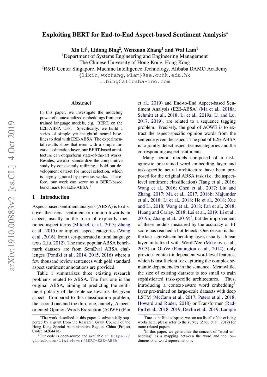 Exploiting BERT for End-to-End Aspect-based Sentiment Analysis
