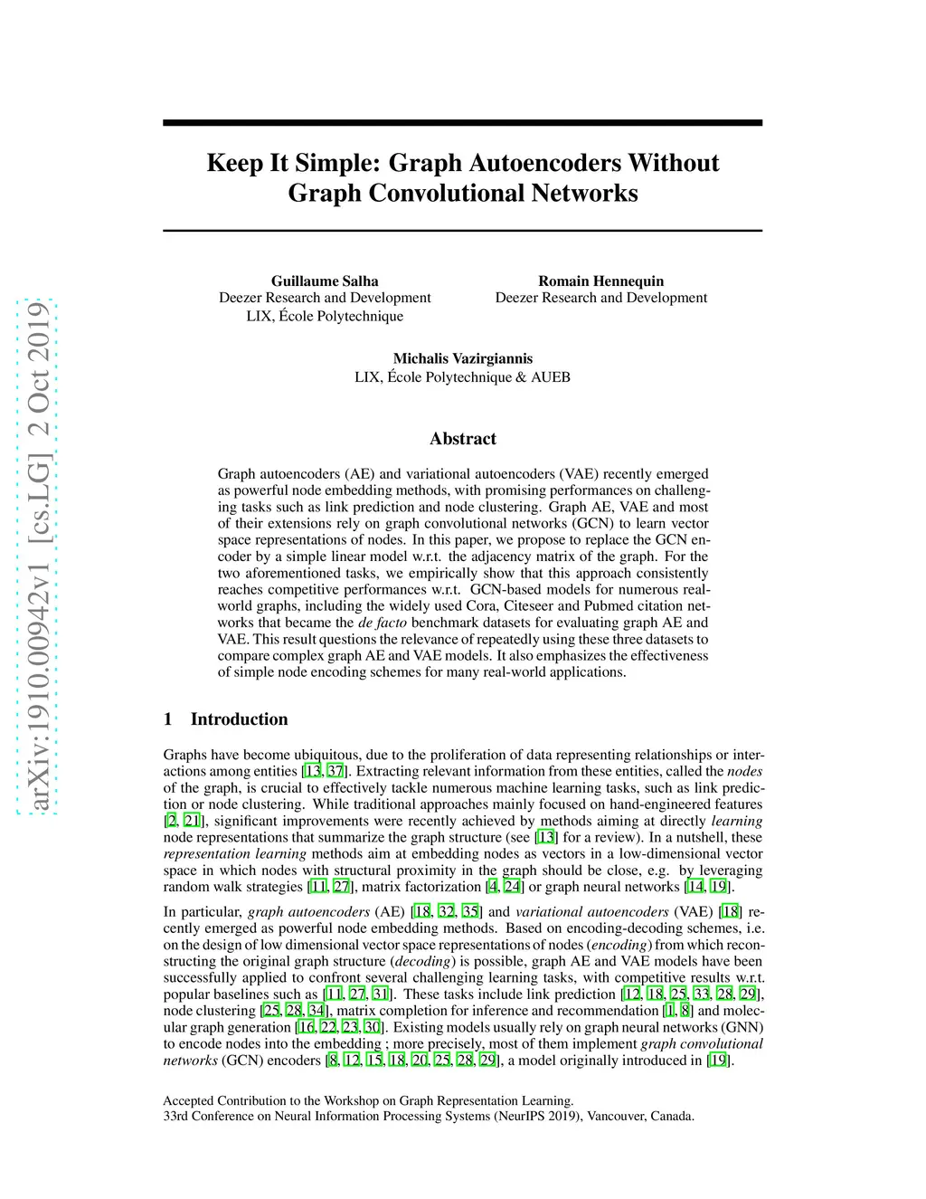 Graph autoencoders (AE) and variational autoencoders (VAE) recently emerged as powerful node embedding methods, with promising performances on challenging tasks such as link prediction and node clustering. Graph AE, VAE and most of their extensions rely on graph convolutional networks (GCN) to learn vector space representations of nodes. In this paper, we propose to replace the GCN encoder by a simple linear model w.r.t. the adjacency matrix of the graph. For the two aforementioned tasks, we empirically show that this approach consistently reaches competitive performances w.r.t. GCN-based models for numerous real-world graphs, including the widely used Cora, Citeseer and Pubmed citation networks that became the de facto benchmark datasets for evaluating graph AE and VAE. This result questions the relevance of repeatedly using these three datasets to compare complex graph AE and VAE models. It also emphasizes the effectiveness of simple node encoding schemes for many real-world applications.