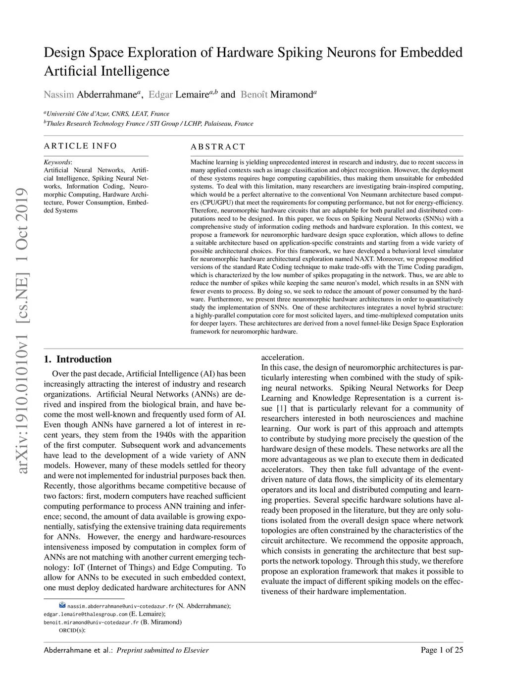 Machine learning is yielding unprecedented interest in research and industry, due to recent success in many applied contexts such as image classification and object recognition. However, the deployment of these systems requires huge computing capabilities, thus making them unsuitable for embedded systems. To deal with this limitation, many researchers are investigating brain-inspired computing, which would be a perfect alternative to the conventional Von Neumann architecture based computers (CPU/GPU) that meet the requirements for computing performance, but not for energy-efficiency. Therefore, neuromorphic hardware circuits that are adaptable for both parallel and distributed computations need to be designed. In this paper, we focus on Spiking Neural Networks (SNNs) with a comprehensive study of information coding methods and hardware exploration. In this context, we propose a framework for neuromorphic hardware design space exploration, which allows to define a suitable architecture based on application-specific constraints and starting from a wide variety of possible architectural choices. For this framework, we have developed a behavioral level simulator for neuromorphic hardware architectural exploration named NAXT. Moreover, we propose modified versions of the standard Rate Coding technique to make trade-offs with the Time Coding paradigm, which is characterized by the low number of spikes propagating in the network. Thus, we are able to reduce the number of spikes while keeping the same neuron's model, which results in an SNN with fewer events to process. By doing so, we seek to reduce the amount of power consumed by the hardware. Furthermore, we present three neuromorphic hardware architectures in order to quantitatively study the implementation of SNNs. These architectures are derived from a novel funnel-like Design Space Exploration framework for neuromorphic hardware.