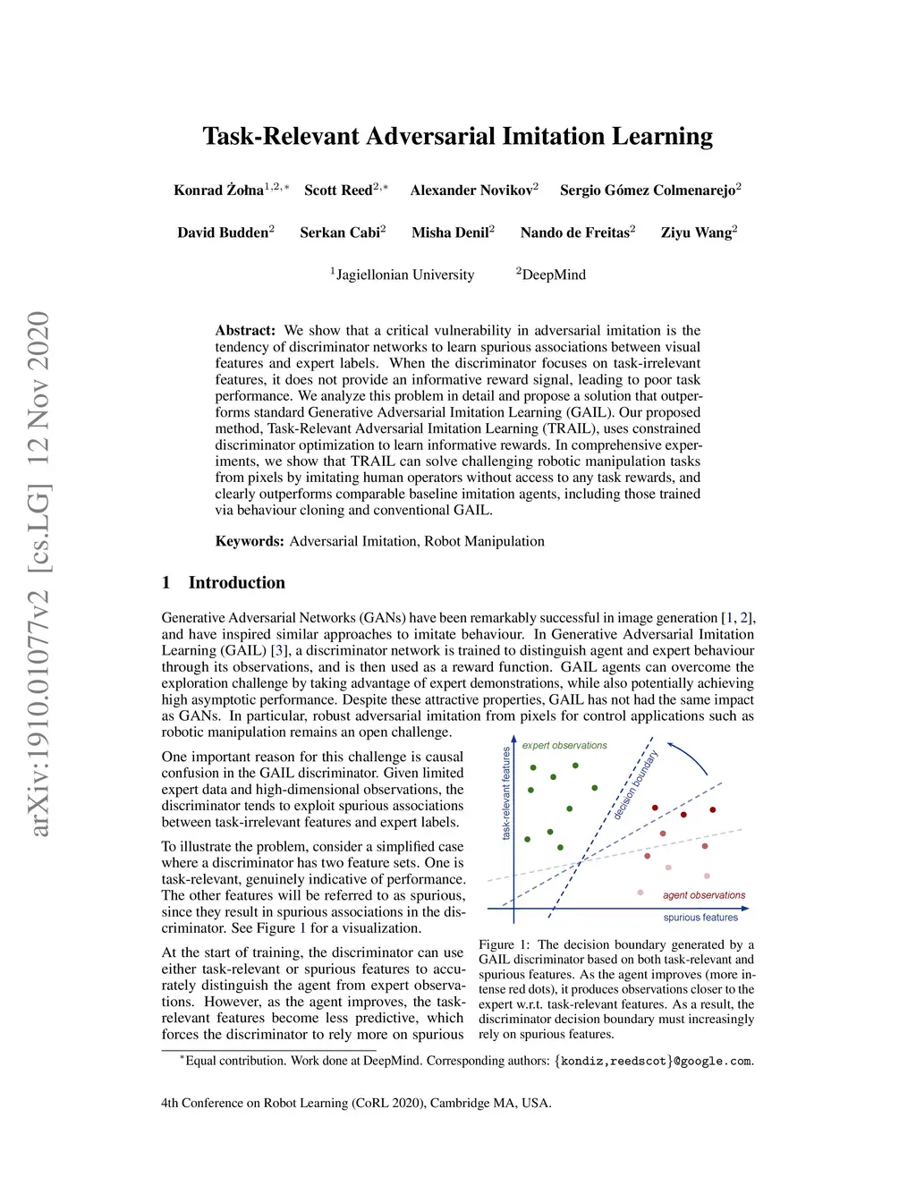 We show that a critical vulnerability in adversarial imitation is the tendency of discriminator networks to learn spurious associations between visual features and expert labels. When the discriminator focuses on task-irrelevant features, it does not provide an informative reward signal, leading to poor task performance. We analyze this problem in detail and propose a solution that outperforms standard Generative Adversarial Imitation Learning (GAIL). Our proposed method, Task-Relevant Adversarial Imitation Learning (TRAIL), uses constrained discriminator optimization to learn informative rewards. In comprehensive experiments, we show that TRAIL can solve challenging robotic manipulation tasks from pixels by imitating human operators without access to any task rewards, and clearly outperforms comparable baseline imitation agents, including those trained via behaviour cloning and conventional GAIL.
