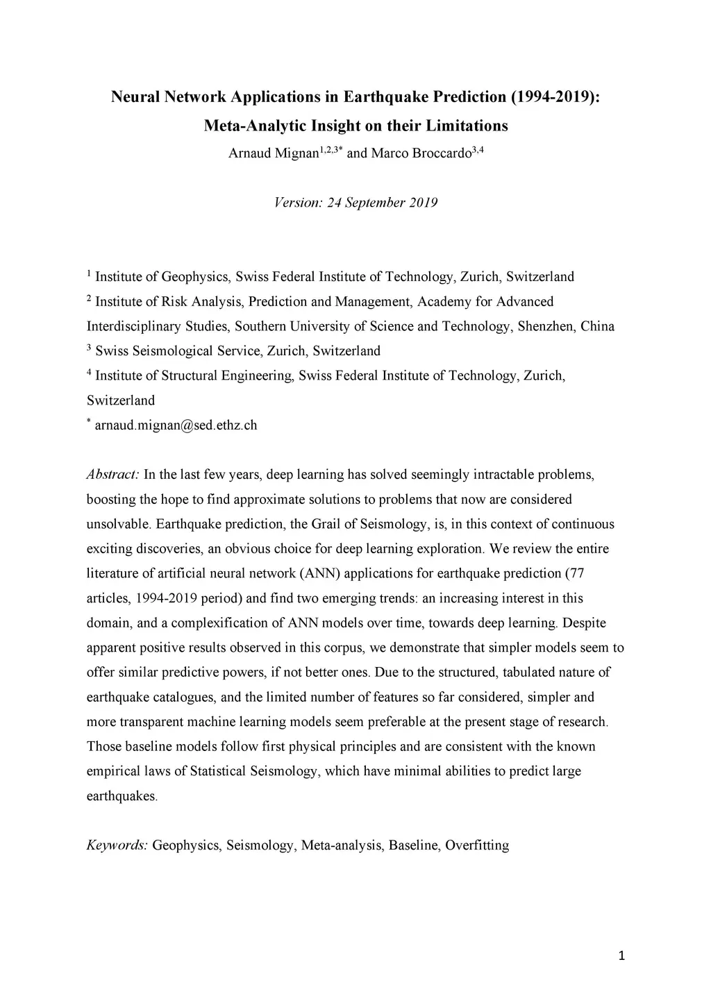 Neural Network Applications in Earthquake Prediction (1994-2019):