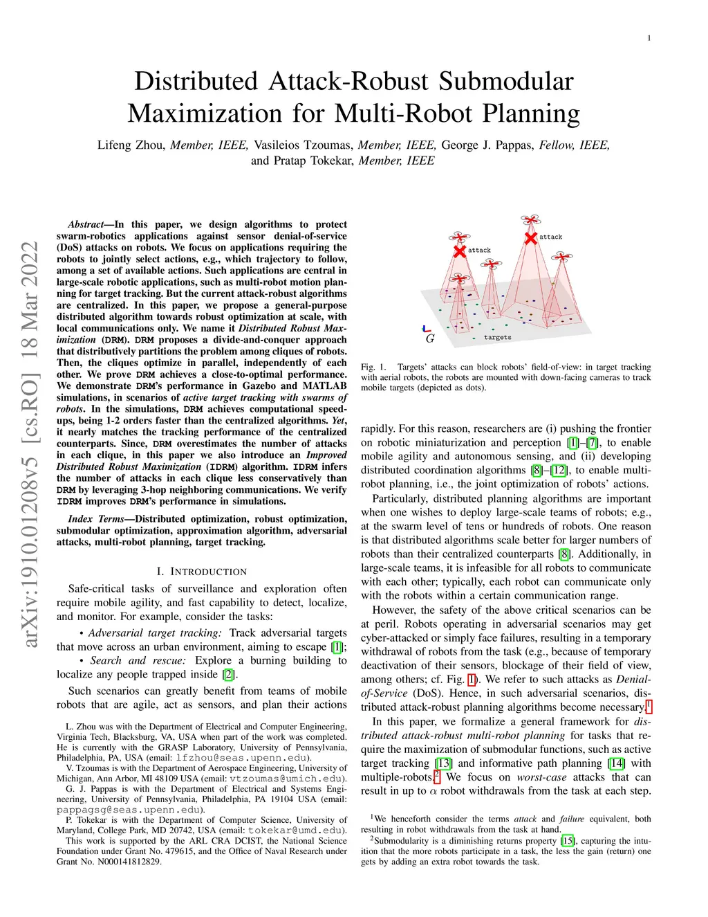 In this paper, we design algorithms to protect swarm-robotics applications against sensor denial-of-service (DoS) attacks on robots. We focus on applications requiring the robots to jointly select actions, e.g., which trajectory to follow, among a set of available ones. Such applications are central in large-scale robotic applications, such as multi-robot motion planning for target tracking. But the current attack-robust algorithms are centralized. In this paper, we propose a general-purpose distributed algorithm towards robust optimization at scale, with local communications only. We name it Distributed Robust Maximization (DRM). DRM proposes a divide-and-conquer approach that distributively partitions the problem among cliques of robots. Then, the cliques optimize in parallel, independently of each other. We prove DRM achieves a close-to-optimal performance. We demonstrate DRM's performance in both Gazebo and MATLAB simulations, in scenarios of active target tracking with swarms of robots. In the simulations, DRM achieves computational speed-ups, being 1-2 orders faster than the centralized algorithms; yet, it nearly matches the tracking performance of the centralized counterparts. Since, DRM overestimates the number of attacks in each clique, in this paper we also introduce an Improved Distributed Robust Maximization (IDRM) algorithm. IDRM infers the number of attacks in each clique less conservatively than DRM by leveraging 3-hop neighboring communications. We verify IDRM improves DRM's performance in simulations.