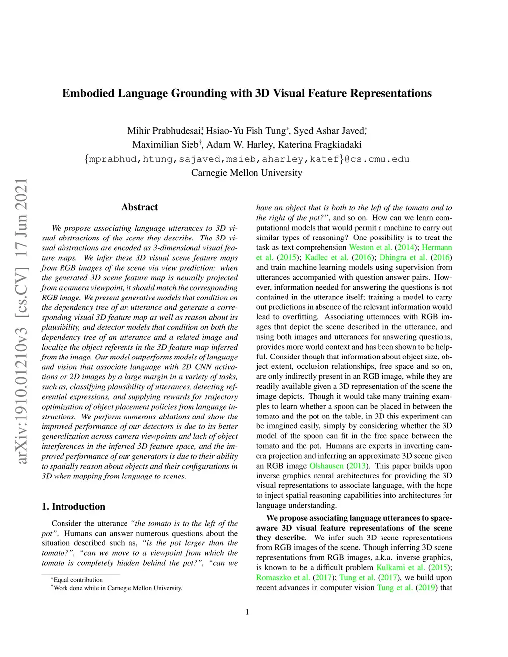We propose associating language utterances to 3D visual abstractions of the scene they describe. The 3D visual abstractions are encoded as 3-dimensional visual feature maps. We infer these 3D visual scene feature maps from RGB images of the scene via view prediction: when the generated 3D scene feature map is neurally projected from a camera viewpoint, it should match the corresponding RGB image. We present generative models that condition on the dependency tree of an utterance and generate a corresponding visual 3D feature map as well as reason about its plausibility, and detector models that condition on both the dependency tree of an utterance and a related image and localize the object referents in the 3D feature map inferred from the image. Our model outperforms models of language and vision that associate language with 2D CNN activations or 2D images by a large margin in a variety of tasks, such as, classifying plausibility of utterances, detecting referential expressions, and supplying rewards for trajectory optimization of object placement policies from language instructions. We perform numerous ablations and show the improved performance of our detectors is due to its better generalization across camera viewpoints and lack of object interferences in the inferred 3D feature space, and the improved performance of our generators is due to their ability to spatially reason about objects and their configurations in 3D when mapping from language to scenes.