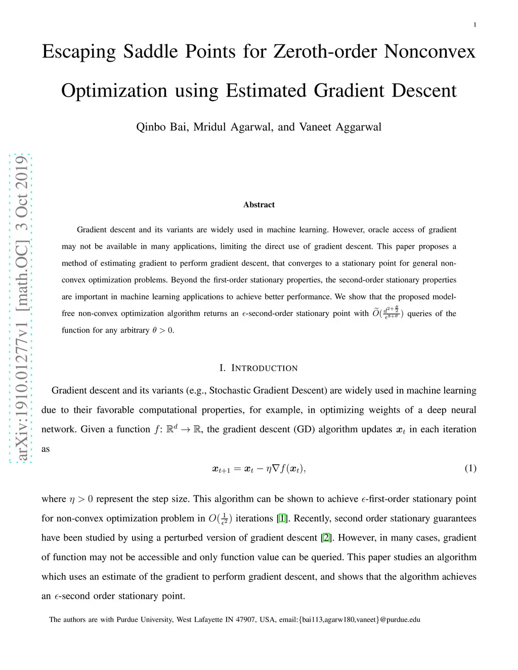 Gradient descent and its variants are widely used in machine learning. However, oracle access of gradient may not be available in many applications, limiting the direct use of gradient descent. This paper proposes a method of estimating gradient to perform gradient descent, that converges to a stationary point for general non-convex optimization problems. Beyond the first-order stationary properties, the second-order stationary properties are important in machine learning applications to achieve better performance. We show that the proposed model-free non-convex optimization algorithm returns an -second-order stationary point with queries of the function for any arbitrary .