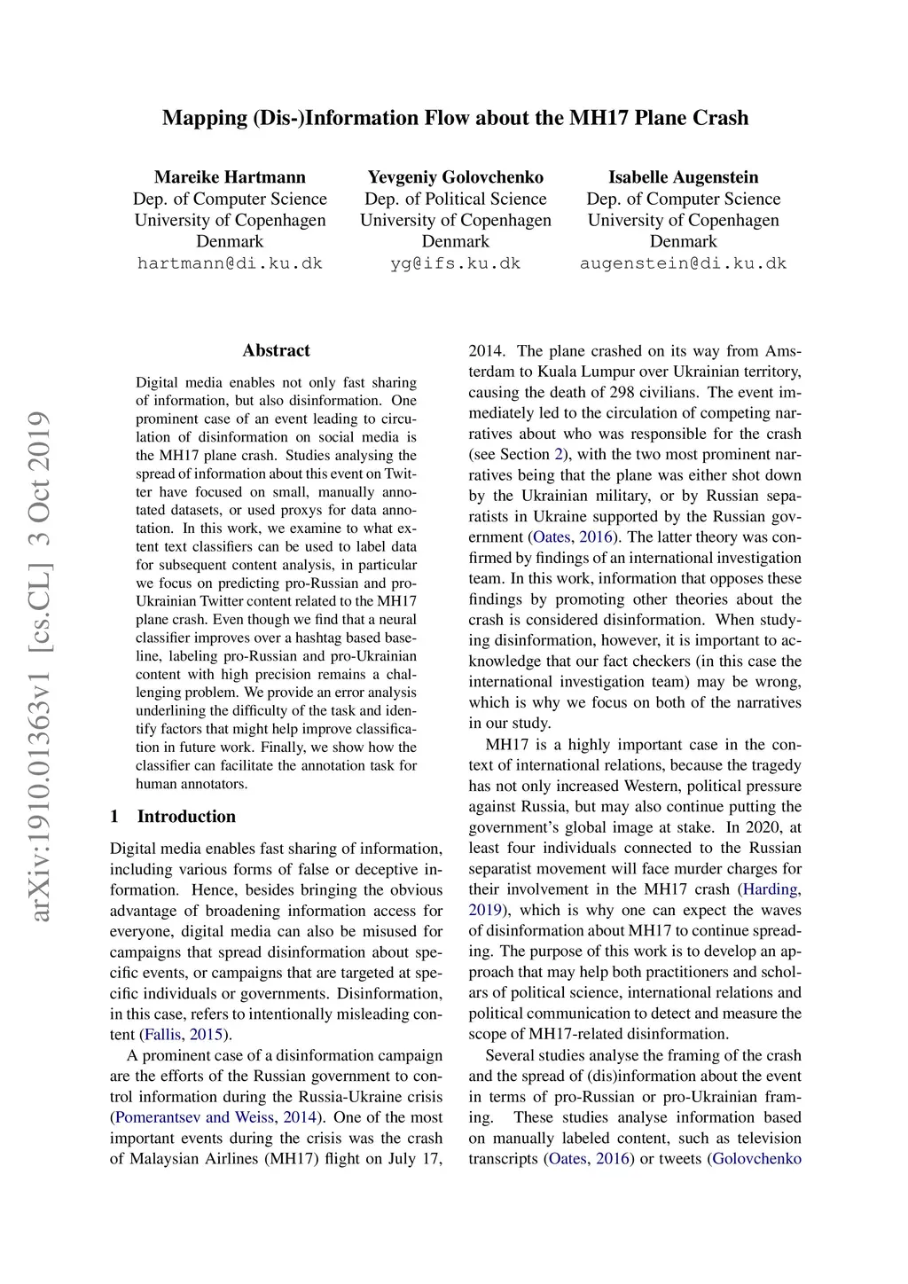 Digital media enables not only fast sharing of information, but also disinformation. One prominent case of an event leading to circulation of disinformation on social media is the MH17 plane crash. Studies analysing the spread of information about this event on Twitter have focused on small, manually annotated datasets, or used proxys for data annotation. In this work, we examine to what extent text classifiers can be used to label data for subsequent content analysis, in particular we focus on predicting pro-Russian and pro-Ukrainian Twitter content related to the MH17 plane crash. Even though we find that a neural classifier improves over a hashtag based baseline, labeling pro-Russian and pro-Ukrainian content with high precision remains a challenging problem. We provide an error analysis underlining the difficulty of the task and identify factors that might help improve classification in future work. Finally, we show how the classifier can facilitate the annotation task for human annotators.