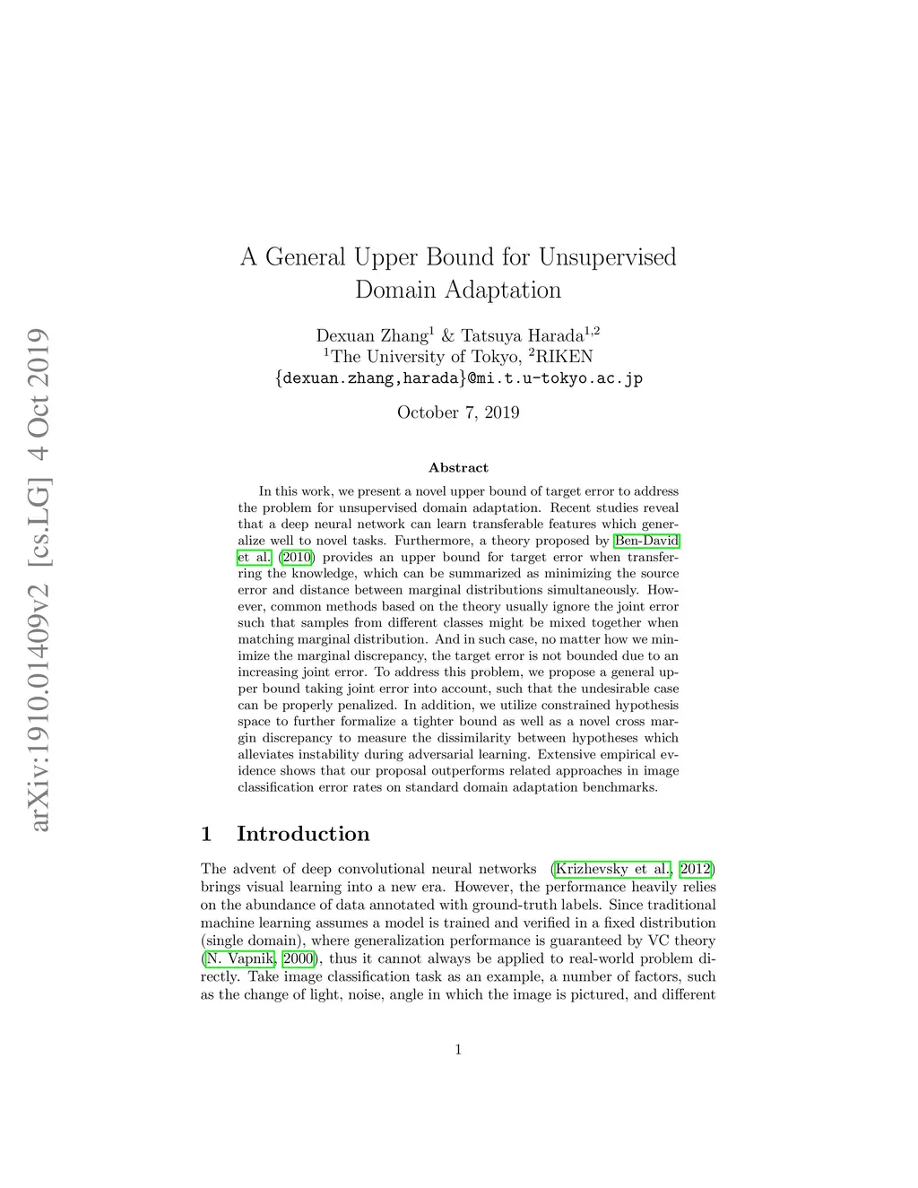 In this work, we present a novel upper bound of target error to address the problem for unsupervised domain adaptation. Recent studies reveal that a deep neural network can learn transferable features which generalize well to novel tasks. Furthermore, a theory proposed by Ben-David et al. (2010) provides a upper bound for target error when transferring the knowledge, which can be summarized as minimizing the source error and distance between marginal distributions simultaneously. However, common methods based on the theory usually ignore the joint error such that samples from different classes might be mixed together when matching marginal distribution. And in such case, no matter how we minimize the marginal discrepancy, the target error is not bounded due to an increasing joint error. To address this problem, we propose a general upper bound taking joint error into account, such that the undesirable case can be properly penalized. In addition, we utilize constrained hypothesis space to further formalize a tighter bound as well as a novel cross margin discrepancy to measure the dissimilarity between hypotheses which alleviates instability during adversarial learning. Extensive empirical evidence shows that our proposal outperforms related approaches in image classification error rates on standard domain adaptation benchmarks.