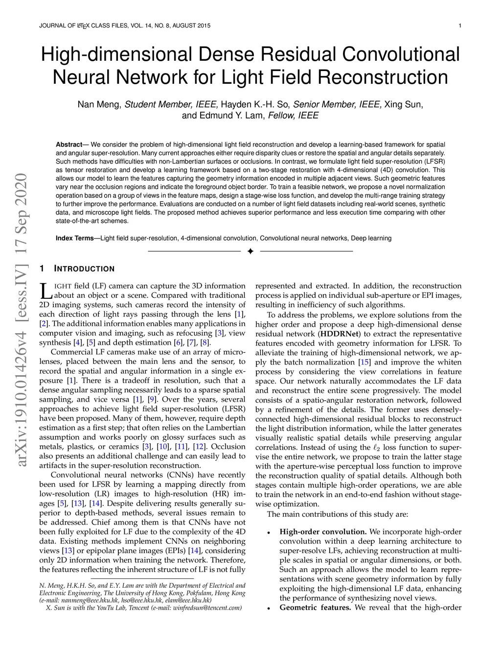 High-dimensional Dense Residual Convolutional Neural Network for Light Field Reconstruction