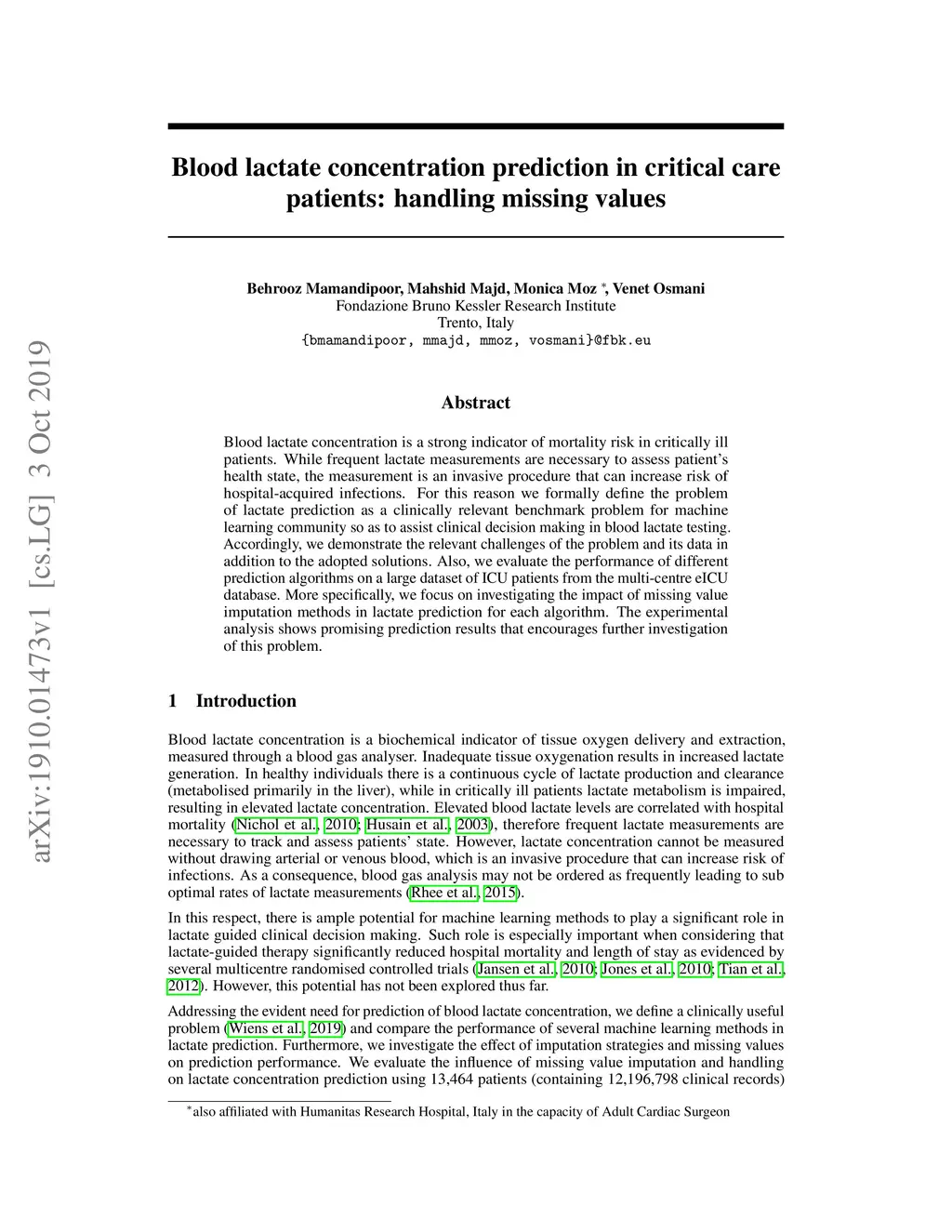 Blood lactate concentration is a strong indicator of mortality risk in critically ill patients. While frequent lactate measurements are necessary to assess patient's health state, the measurement is an invasive procedure that can increase risk of hospital-acquired infections. For this reason we formally define the problem of lactate prediction as a clinically relevant benchmark problem for machine learning community so as to assist clinical decision making in blood lactate testing. Accordingly, we demonstrate the relevant challenges of the problem and its data in addition to the adopted solutions. Also, we evaluate the performance of different prediction algorithms on a large dataset of ICU patients from the multi-centre eICU database. More specifically, we focus on investigating the impact of missing value imputation methods in lactate prediction for each algorithm. The experimental analysis shows promising prediction results that encourages further investigation of this problem.