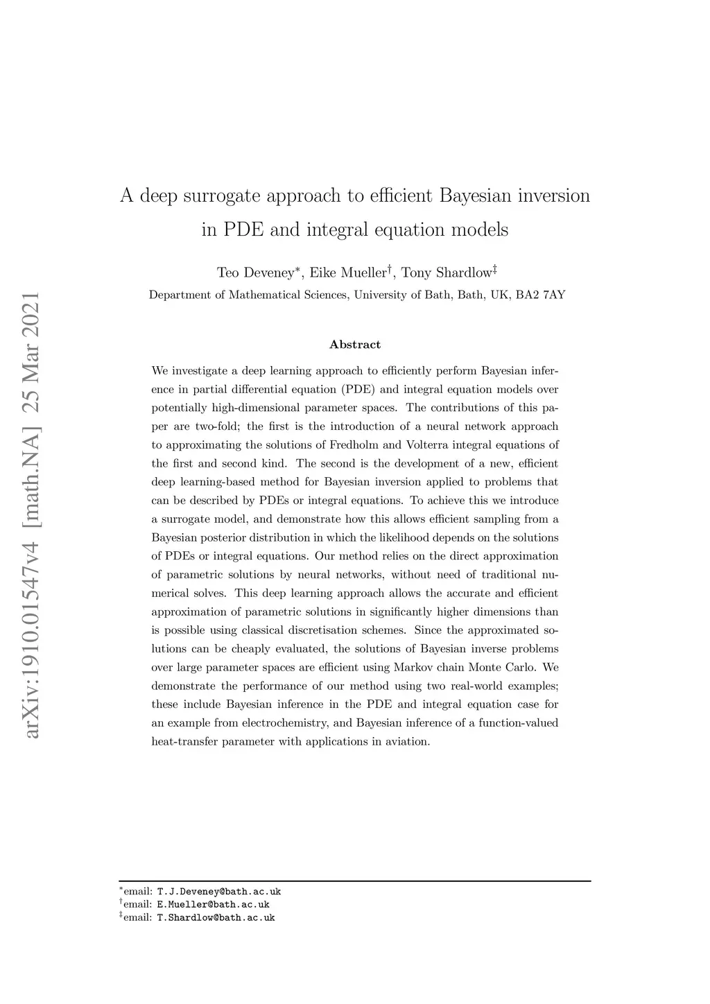 We investigate a deep learning approach to efficiently perform Bayesian inference in partial differential equation (PDE) and integral equation models over potentially high-dimensional parameter spaces. The contributions of this paper are two-fold; the first is the introduction of a neural network approach to approximating the solutions of Fredholm and Volterra integral equations of the first and second kind. The second is the development of a new, efficient deep learning-based method for Bayesian inversion applied to problems that can be described by PDEs or integral equations. To achieve this we introduce a surrogate model, and demonstrate how this allows efficient sampling from a Bayesian posterior distribution in which the likelihood depends on the solutions of PDEs or integral equations. Our method relies on the direct approximation of parametric solutions by neural networks, without need of traditional numerical solves. This deep learning approach allows the accurate and efficient approximation of parametric solutions in significantly higher dimensions than is possible using classical discretisation schemes. Since the approximated solutions can be cheaply evaluated, the solutions of Bayesian inverse problems over large parameter spaces are efficient using Markov chain Monte Carlo. We demonstrate the performance of our method using two real-world examples; these include Bayesian inference in the PDE and integral equation case for an example from electrochemistry, and Bayesian inference of a function-valued heat-transfer parameter with applications in aviation.