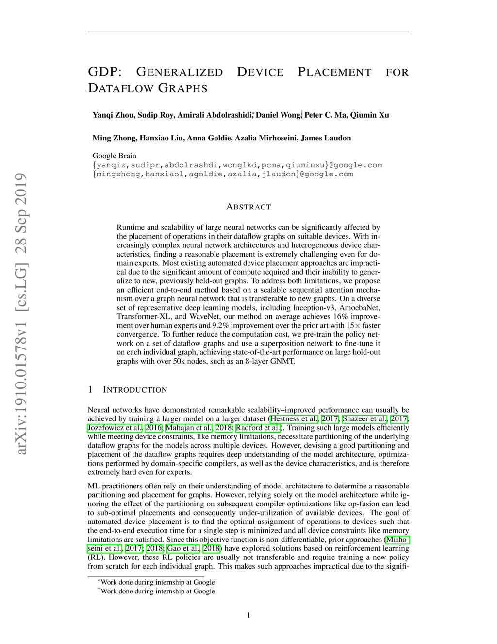 Runtime and scalability of large neural networks can be significantly affected by the placement of operations in their dataflow graphs on suitable devices. With increasingly complex neural network architectures and heterogeneous device characteristics, finding a reasonable placement is extremely challenging even for domain experts. Most existing automated device placement approaches are impractical due to the significant amount of compute required and their inability to generalize to new, previously held-out graphs. To address both limitations, we propose an efficient end-to-end method based on a scalable sequential attention mechanism over a graph neural network that is transferable to new graphs. On a diverse set of representative deep learning models, including Inception-v3, AmoebaNet, Transformer-XL, and WaveNet, our method on average achieves 16% improvement over human experts and 9.2% improvement over the prior art with 15 times faster convergence. To further reduce the computation cost, we pre-train the policy network on a set of dataflow graphs and use a superposition network to fine-tune it on each individual graph, achieving state-of-the-art performance on large hold-out graphs with over 50k nodes, such as an 8-layer GNMT.