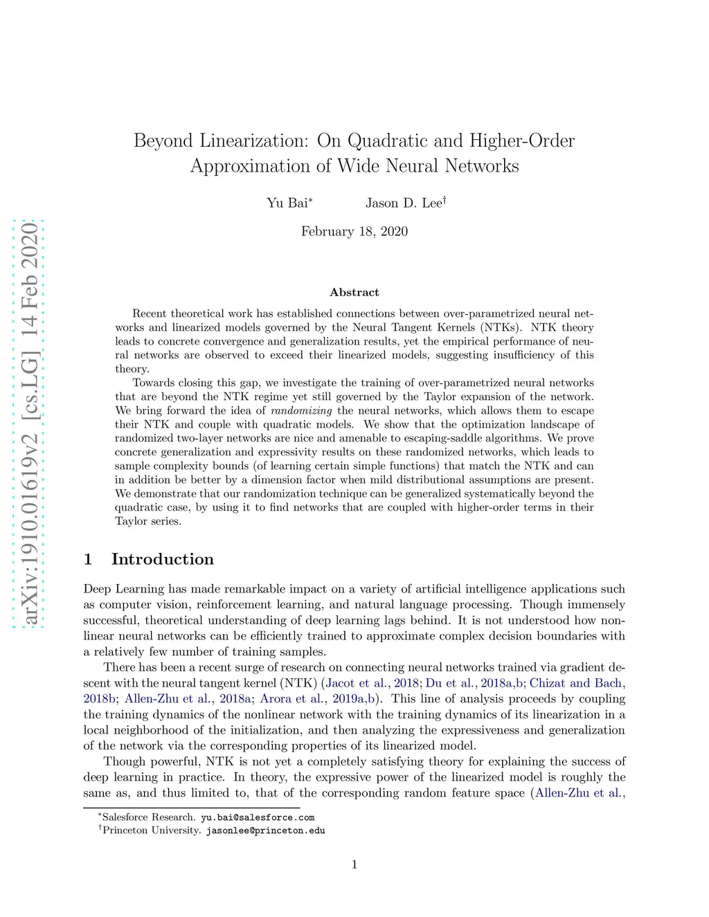 Recent theoretical work has established connections between over-parametrized neural networks and linearized models governed by he Neural Tangent Kernels (NTKs). NTK theory leads to concrete convergence and generalization results, yet the empirical performance of neural networks are observed to exceed their linearized models, suggesting insufficiency of this theory. Towards closing this gap, we investigate the training of over-parametrized neural networks that are beyond the NTK regime yet still governed by the Taylor expansion of the network. We bring forward the idea of \emph{randomizing} the neural networks, which allows them to escape their NTK and couple with quadratic models. We show that the optimization landscape of randomized two-layer networks are nice and amenable to escaping-saddle algorithms. We prove concrete generalization and expressivity results on these randomized networks, which lead to sample complexity bounds (of learning certain simple functions) that match the NTK and can in addition be better by a dimension factor when mild distributional assumptions are present. We demonstrate that our randomization technique can be generalized systematically beyond the quadratic case, by using it to find networks that are coupled with higher-order terms in their Taylor series.
