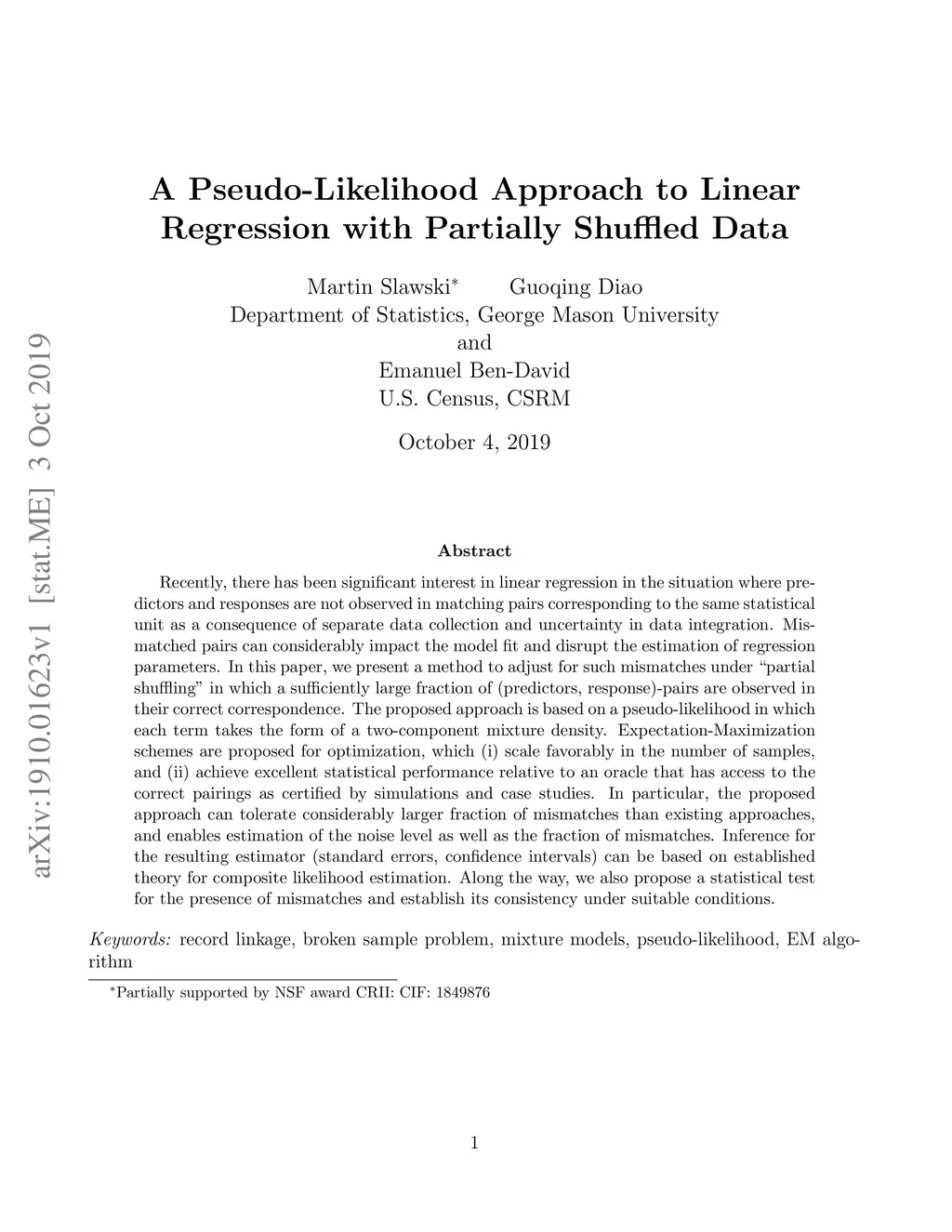 Recently, there has been significant interest in linear regression in the situation where predictors and responses are not observed in matching pairs corresponding to the same statistical unit as a consequence of separate data collection and uncertainty in data integration. Mismatched pairs can considerably impact the model fit and disrupt the estimation of regression parameters. In this paper, we present a method to adjust for such mismatches under ``partial shuffling" in which a sufficiently large fraction of (predictors, response)-pairs are observed in their correct correspondence. The proposed approach is based on a pseudo-likelihood in which each term takes the form of a two-component mixture density. Expectation-Maximization schemes are proposed for optimization, which (i) scale favorably in the number of samples, and (ii) achieve excellent statistical performance relative to an oracle that has access to the correct pairings as certified by simulations and case studies. In particular, the proposed approach can tolerate considerably larger fraction of mismatches than existing approaches, and enables estimation of the noise level as well as the fraction of mismatches. Inference for the resulting estimator (standard errors, confidence intervals) can be based on established theory for composite likelihood estimation. Along the way, we also propose a statistical test for the presence of mismatches and establish its consistency under suitable conditions.