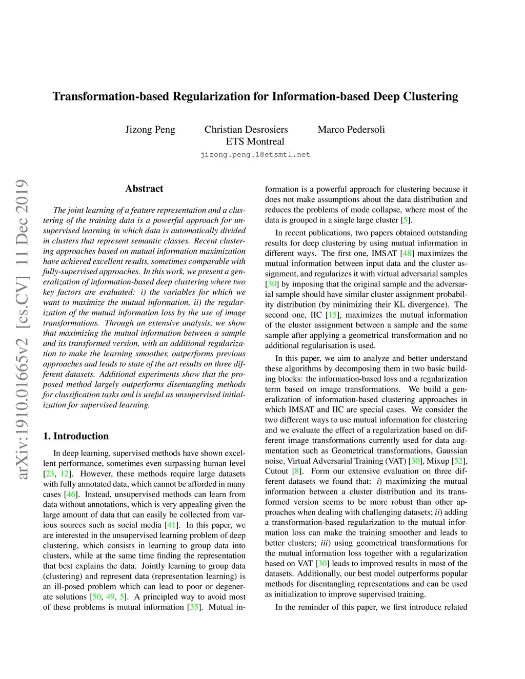 Recently, two methods have shown outstanding performance for clustering images and jointly learning the feature representation. The first, called Information Maximiz-ing Self-Augmented Training (IMSAT), maximizes the mutual information between input and clusters while using a regularization term based on virtual adversarial examples. The second, named Invariant Information Clustering (IIC), maximizes the mutual information between the clustering of a sample and its geometrically transformed version. These methods use mutual information in distinct ways and leverage different kinds of transformations. This work proposes a comprehensive analysis of transformation and losses for deep clustering, where we compare numerous combinations of these two components and evaluate how they interact with one another. Results suggest that mutual information between a sample and its transformed representation leads to state-of-the-art performance for deep clustering, especially when used jointly with geometrical and adversarial transformations.