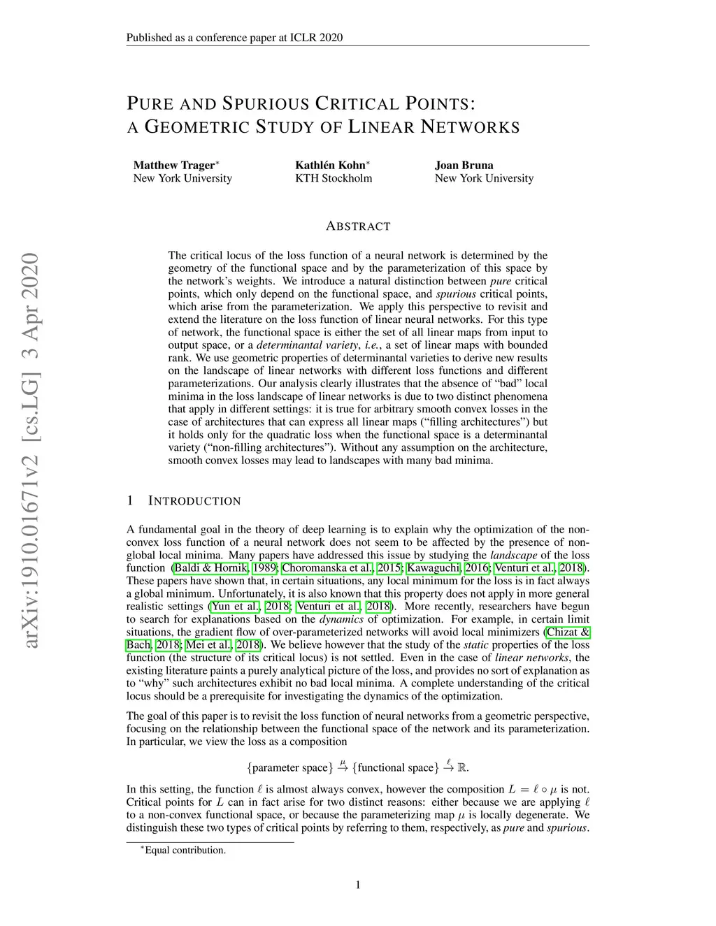 The critical locus of the loss function of a neural network is determined by the geometry of the functional space and by the parameterization of this space by the network's weights. We introduce a natural distinction between pure critical points, which only depend on the functional space, and spurious critical points, which arise from the parameterization. We apply this perspective to revisit and extend the literature on the loss function of linear neural networks. For this type of network, the functional space is either the set of all linear maps from input to output space, or a determinantal variety, i.e., a set of linear maps with bounded rank. We use geometric properties of determinantal varieties to derive new results on the landscape of linear networks with different loss functions and different parameterizations. Our analysis clearly illustrates that the absence of "bad" local minima in the loss landscape of linear networks is due to two distinct phenomena that apply in different settings: it is true for arbitrary smooth convex losses in the case of architectures that can express all linear maps ("filling architectures") but it holds only for the quadratic loss when the functional space is a determinantal variety ("non-filling architectures"). Without any assumption on the architecture, smooth convex losses may lead to landscapes with many bad minima.