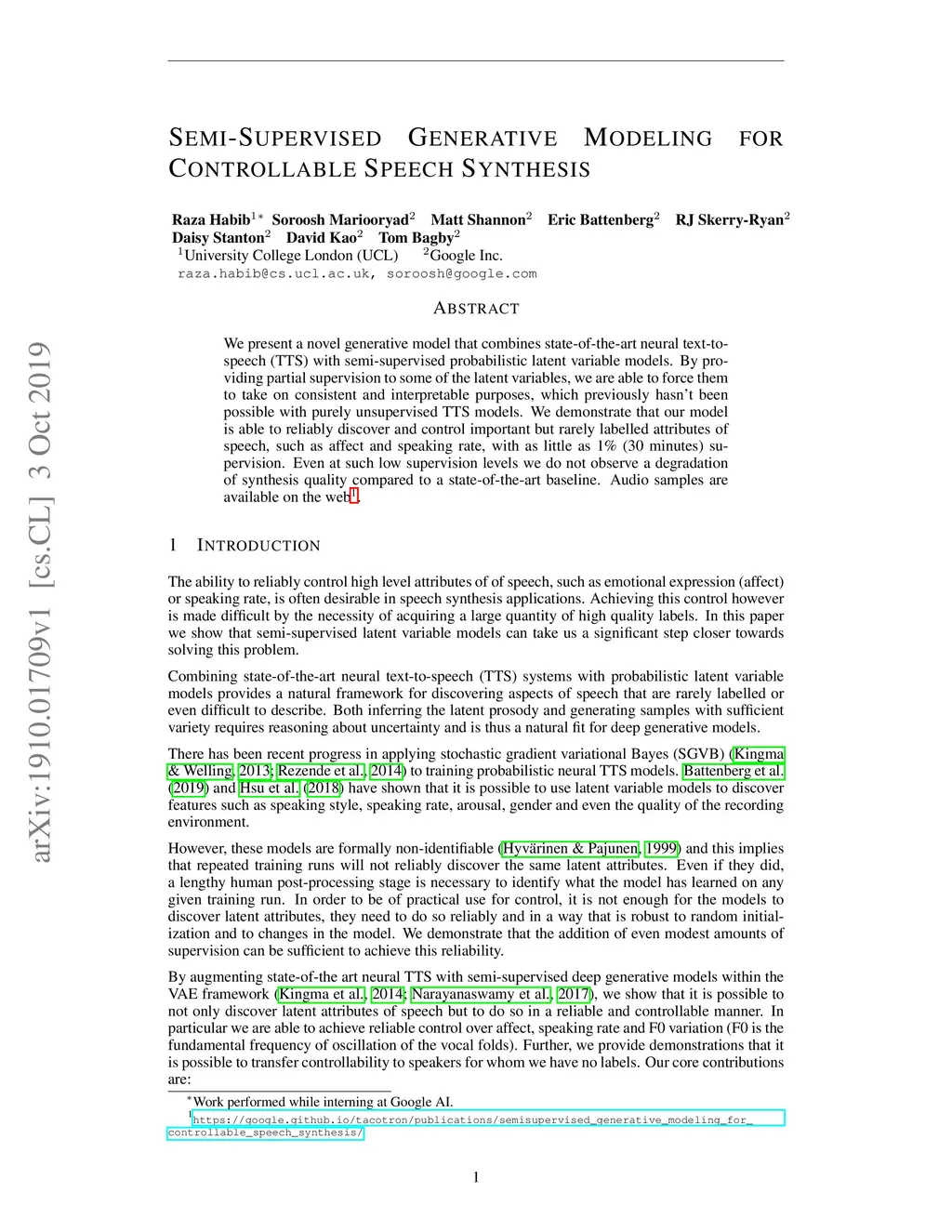 We present a novel generative model that combines state-of-the-art neural text-to-speech (TTS) with semi-supervised probabilistic latent variable models. By providing partial supervision to some of the latent variables, we are able to force them to take on consistent and interpretable purposes, which previously hasn't been possible with purely unsupervised TTS models. We demonstrate that our model is able to reliably discover and control important but rarely labelled attributes of speech, such as affect and speaking rate, with as little as 1% (30 minutes) supervision. Even at such low supervision levels we do not observe a degradation of synthesis quality compared to a state-of-the-art baseline. Audio samples are available on the web.
