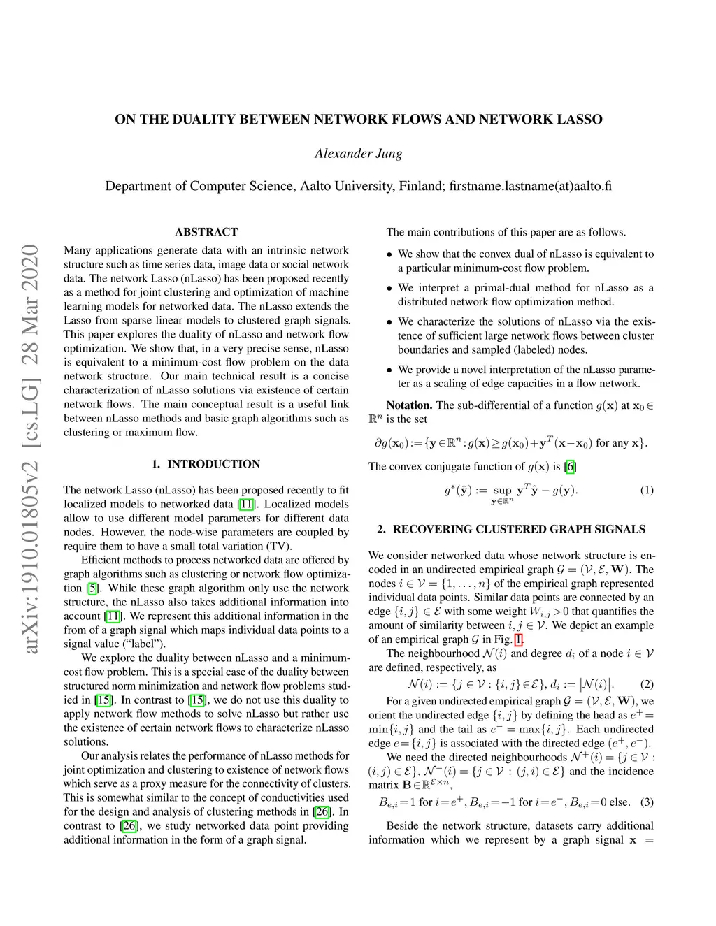 The data arising in many application domains have an intrinsic network structure. Such network structure is computationally apprealing due to the availability of highly scalable graph algorithms. An important class of graph algorithms is related to optimizing network flows. This paper explores the duality of network flow methods and the recently proposed network Lasso. Network Lasso extends the Lasso method from sparse linear models to clustered graph signals. It turns out that the computational and statistical properties of network Lasso crucially depends on the existence of sufficiently large network flows. Using elementary tools from convex analysis, we offer a precise characterization of the duality between network Lasso and a minimum cost network flow problem. This duality provides a strong link between network Lasso methods and network flow algorithms.