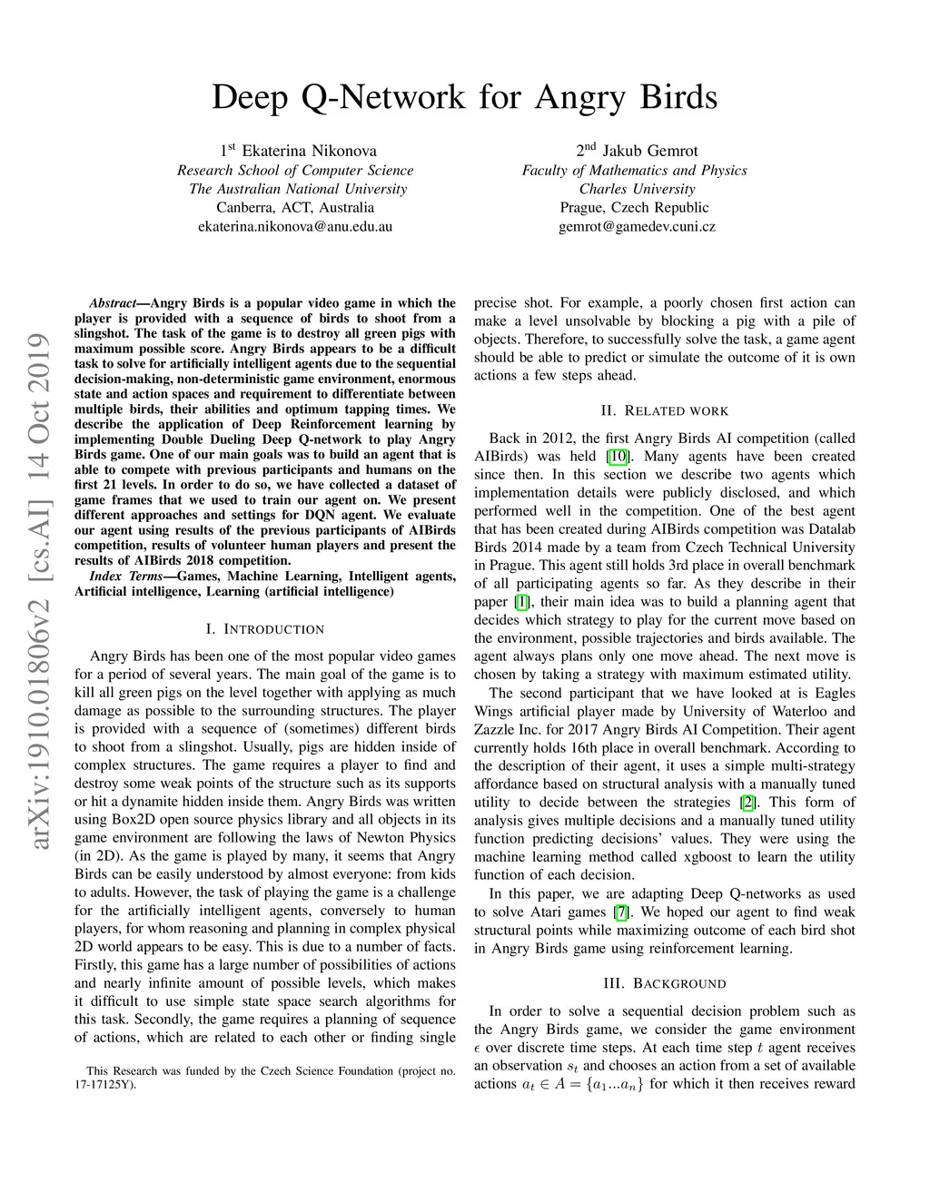 Angry Birds is a popular video game in which the player is provided with a sequence of birds to shoot from a slingshot. The task of the game is to destroy all green pigs with maximum possible score. Angry Birds appears to be a difficult task to solve for artificially intelligent agents due to the sequential decision-making, non-deterministic game environment, enormous state and action spaces and requirement to differentiate between multiple birds, their abilities and optimum tapping times. We describe the application of Deep Reinforcement learning by implementing Double Dueling Deep Q-network to play Angry Birds game. One of our main goals was to build an agent that is able to compete with previous participants and humans on the first 21 levels. In order to do so, we have collected a dataset of game frames that we used to train our agent on. We present different approaches and settings for DQN agent. We evaluate our agent using results of the previous participants of AIBirds competition, results of volunteer human players and present the results of AIBirds 2018 competition.